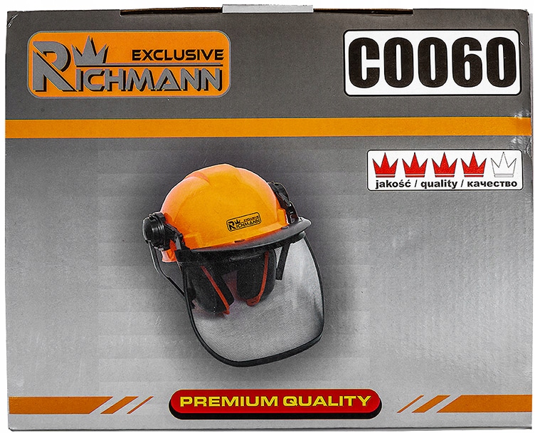 Сітка з дуже хорошою прозорістю відповідає стандартам EN1731:2007. Навушники з звукоізоляцією SNR 23 дБ, які пригнічують шкідливі звуки, відповідають стандартам EN352-3:2003. Оснащений козирком для запобігання сонячних відблисків під час роботи. Головний чохол оброблений м'яким тепловідвідним поролоном і текстильною гумою. Шолом регулюється за розміром за допомогою спеціальної ручки. Преміальна якість.
