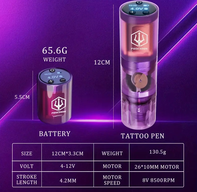 Професійний комплект татуювання - відмінний вибір для початківців та вдосконалених художників! А може, ви хочете подарувати коханій людині унікальний подарунок? Це професійний комплект татуювань - це ідеальне рішення для обох людей, які роблять свої перші кроки в галузі, і для більш досвідчених татуювань! Poseidon , який поєднує в собі сучасний дизайн, комфорт використання та виняткові показники. Завдяки цифровому дисплеї ви можете точно контролювати напругу, а сильний акумулятор забезпечує тривалий робочий час без необхідності частого зарядки. Машина працює безперебійно і тихо, що має вирішальне значення для комфорту як татуювання, так і клієнта.