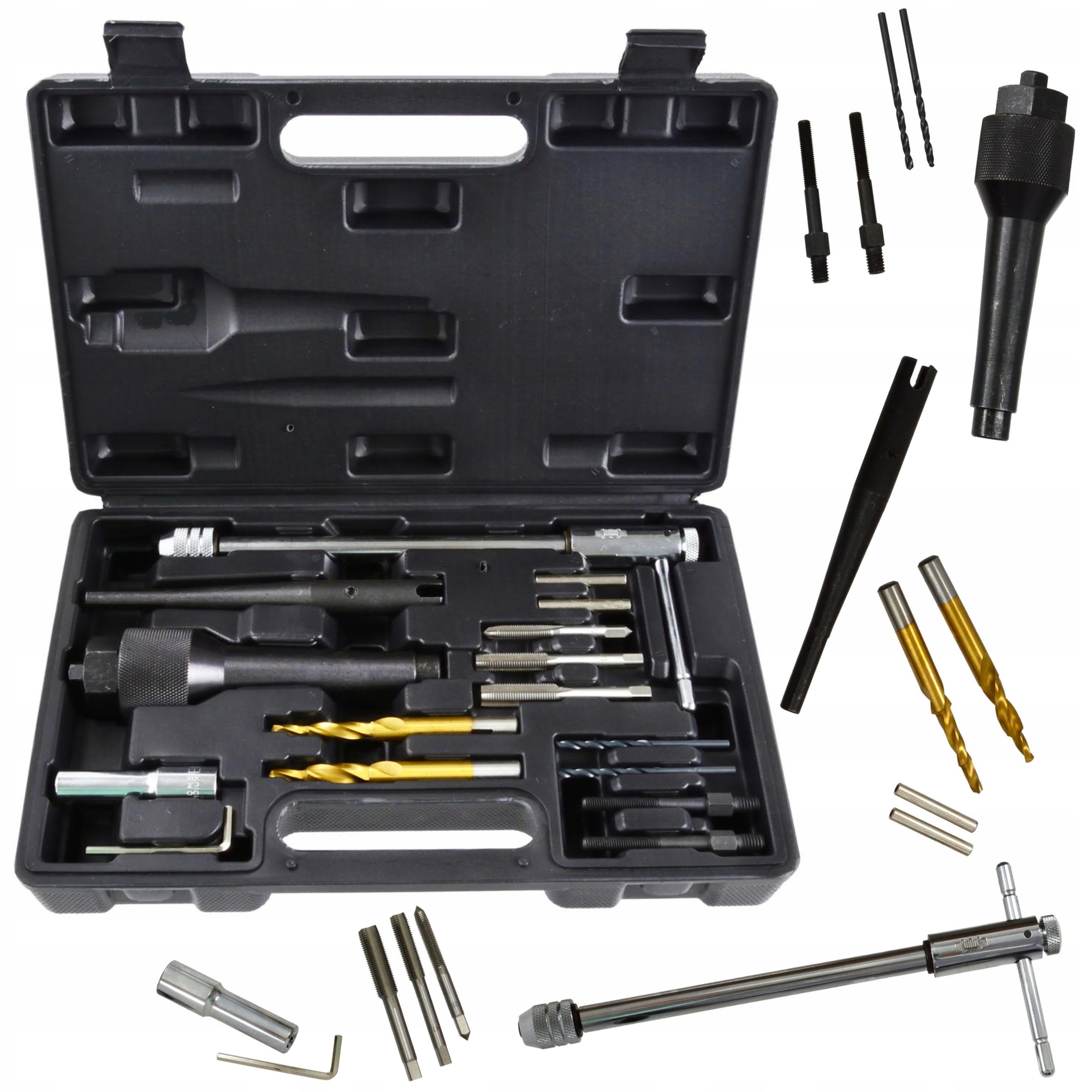 Професійний набір для демонтажу зламаних свічок розжарювання та ремонту різьби. Набір дозволяє демонтувати свічки розжарювання з різьбою М8 і М10. Ремонт можна провести без демонтажу головки - в цьому випадку замість відповідного інжектора слід встановити пневматичний перехідник. Стиснене повітря запобігає потраплянню залишків обробки в камеру згоряння.