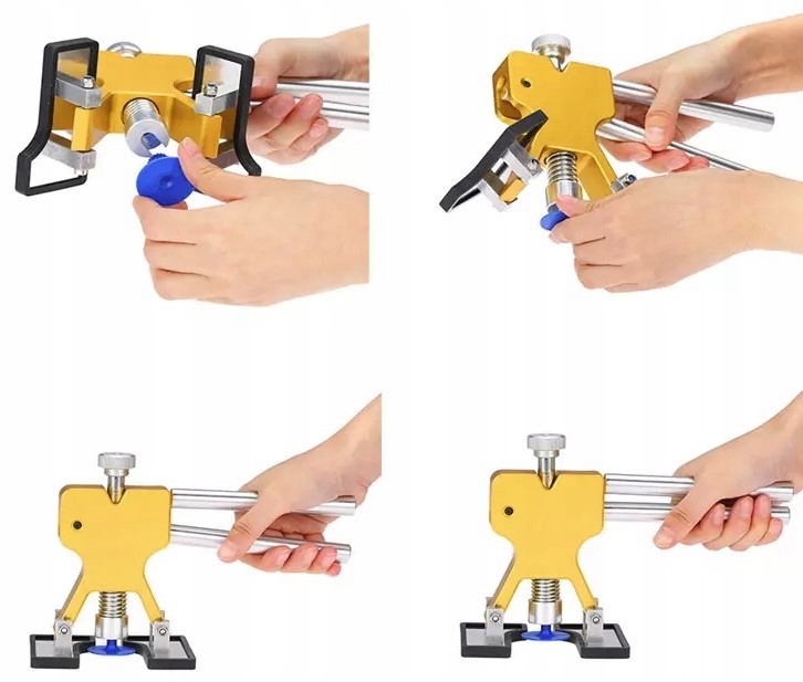 Перед використанням ретельно очистіть і знежирте поверхню. Нанесіть гарячий клей на плоску частину пластикового адаптера і натисніть на нього в тому місці, де ви хочете розтягнути кузов. Дайте клею застигнути, прикріпіть знімач до кінця, затягніть гвинт до вм’ятини і починайте притискати ручки один до одного. Випрямляючи деформовану поверхню, не потрібно застосовувати велику фізичну силу.