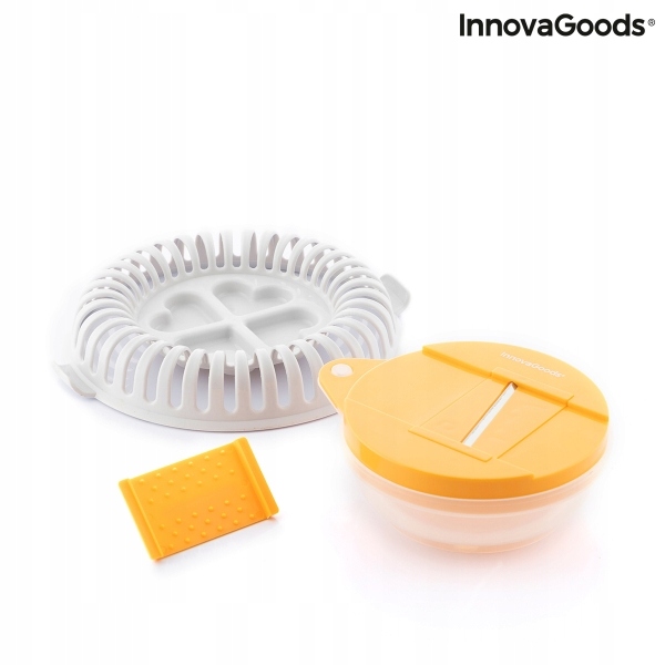 Частина посуду, оснащена слайсером і захистом для пальців, дозволяє нарізати овочі рівномірно, точно та безпечно. Основа форми для мікрохвильовки має прорізи для розміщення тонко нарізаних овочів, 2 маленькі ручки для захоплення, а в середній частині 4 відділення для соусів, тому її можна використовувати і для подачі чіпсів на стіл. Час приготування в мікрохвильовці 3-5 хвилин. У набір входять рецепти різноманітних соусів, які є ідеальним доповненням до чіпсів.