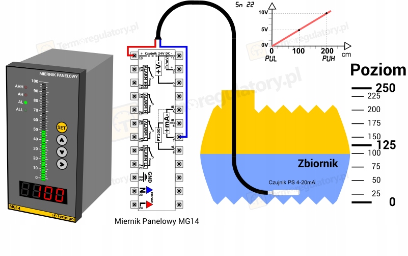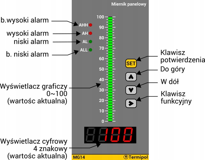 Панельний вимірювач MG14 функціонує як панельний індикатор, який забезпечує точний контроль вимірюваних параметрів у промислових процесах і в домашніх проектах. Завдяки функції конвертера можна швидко конвертувати сигнал від датчика в значення, необхідні для вимірювання рівня води (мм, см, м) або кількості води (літри). Пристрій також має функцію налаштування на діапазон вхідного сигналу.