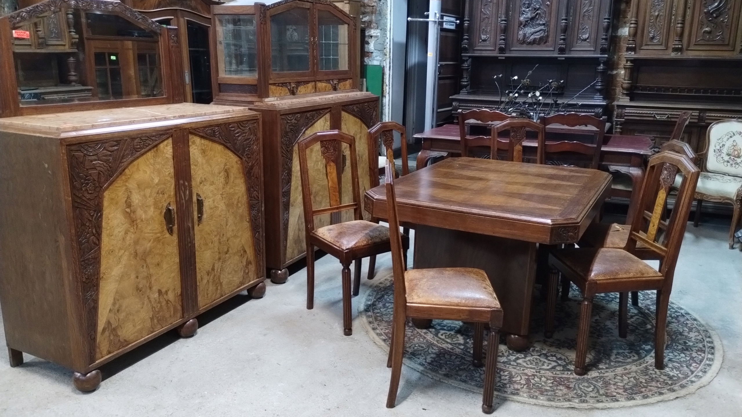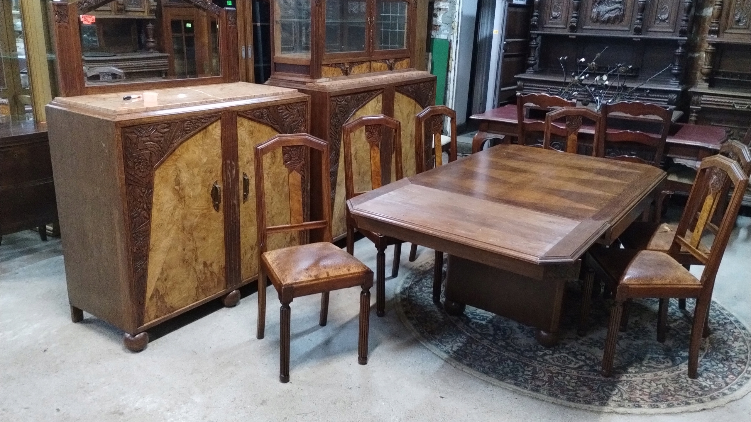 Набір меблів для їдальні в стилі арт-деко 1920-х років із Франції. Він складається з комода з вітриною, комода з дзеркалом, висувного столу та шести стільців.