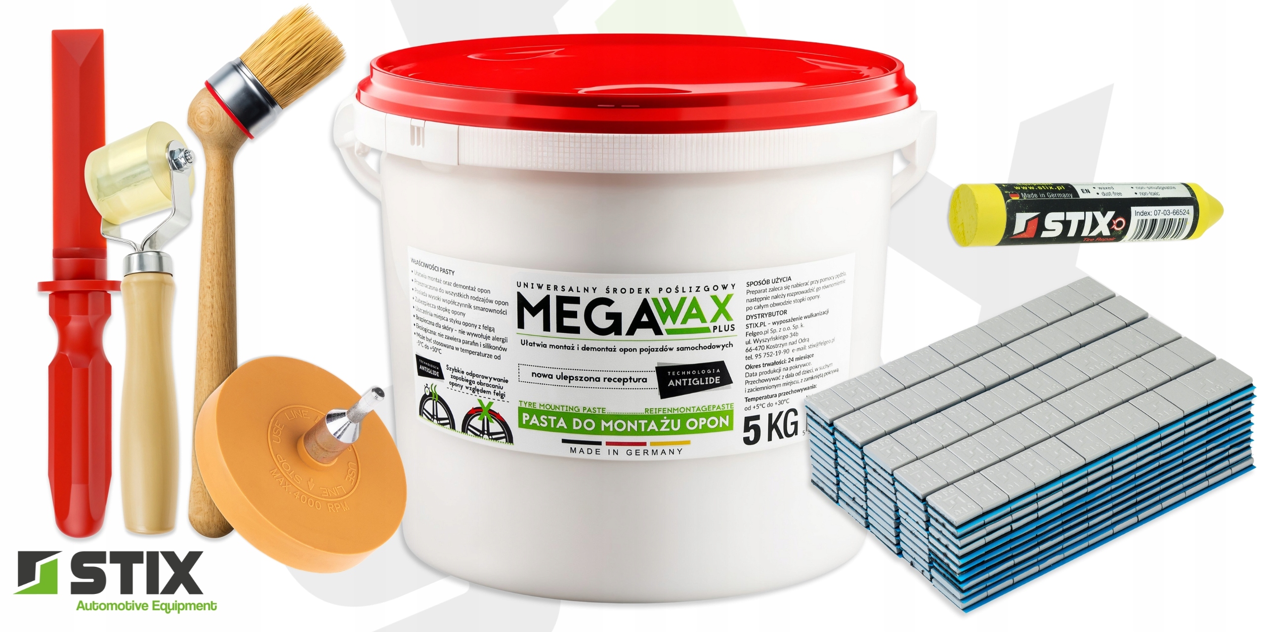 - Паста монтажна MEGA WAX Plus 5 кг | 1 шт. – універсальне мастило для всіх типів шин, збагачене технологією ANTIGLIDE. Полегшує встановлення та зняття шин, захищає борт і запобігає ковзанню по ободу.