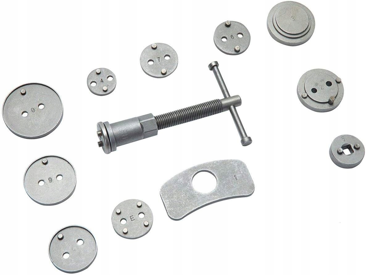 Професійний набір з 12 предметів для реверсування/віджиму поршнів у циліндрах гальмівної системи, необхідний при ремонті автомобілів з дисковими гальмами.