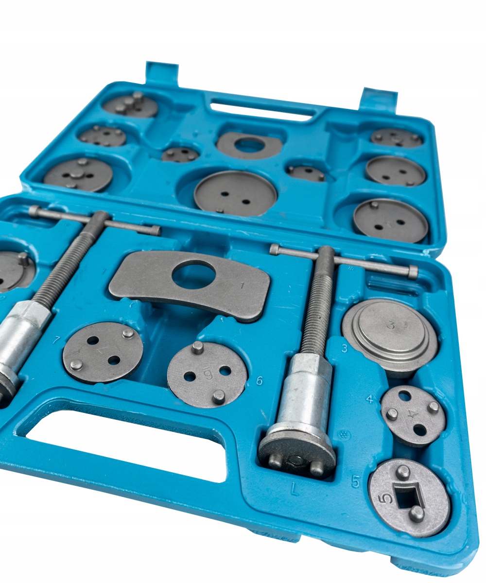 Набір включає два преси (правий і лівий поворотний), дві різні за формою балки для притиску преса до сідла супорта та 17 адаптерів, адаптованих до розміру гальмівних поршнів, що використовуються в більшості легкових автомобілів, вироблених на європейському та азіатському ринках.