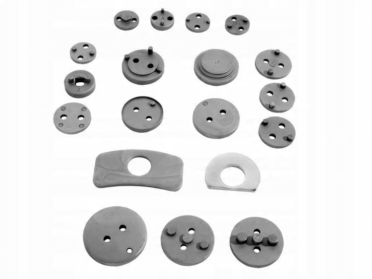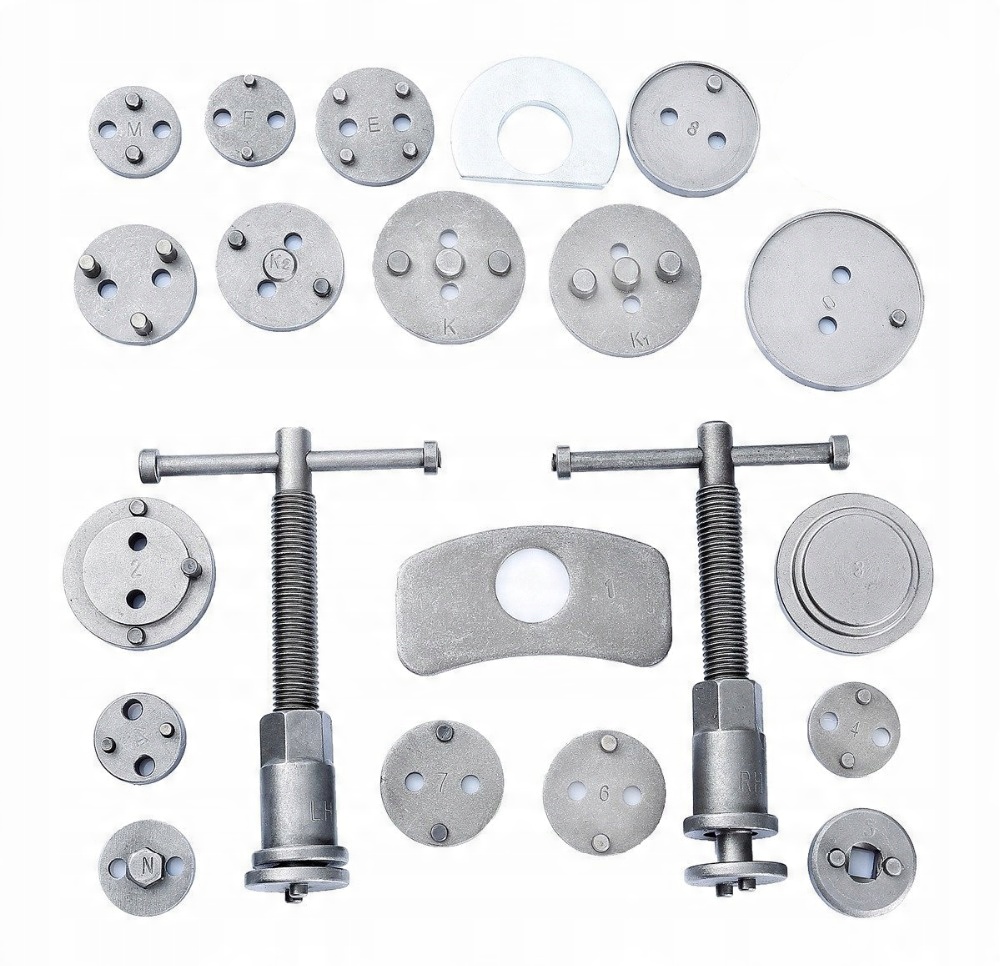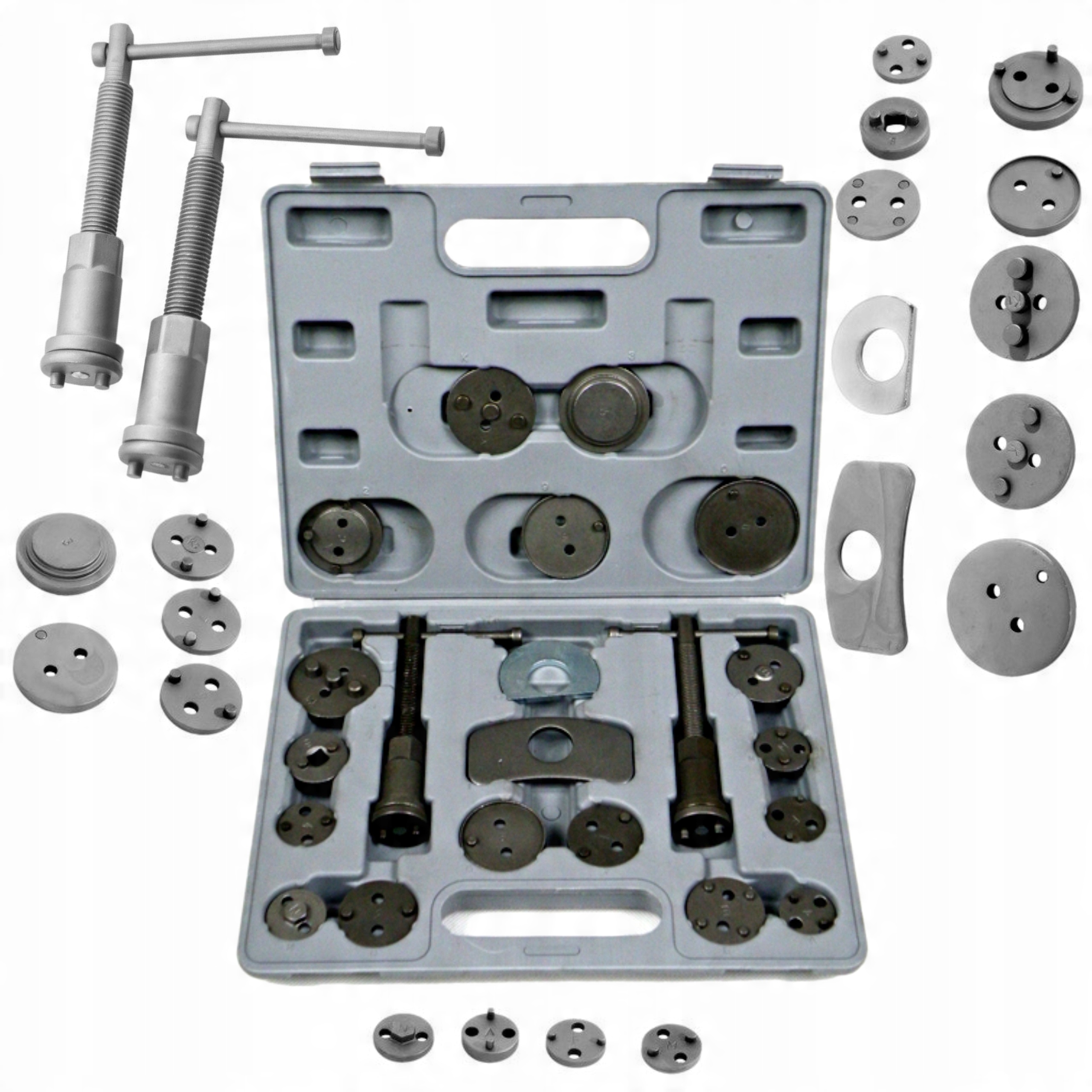 У набір входять два преси (правий і лівий поворотний), дві різноформовані балки для притиску преса до сідла супорта і 17 перехідників, адаптованих під розміри гальмівних поршнів, що використовуються в більшості легкових автомобілів, що випускаються на європейському ринку. та азіатські ринки. Набір виготовлений з високоякісної сталі, упакований в ударостійкий і дуже зручний для носіння ручку, яка тримає кожен адаптер. p>