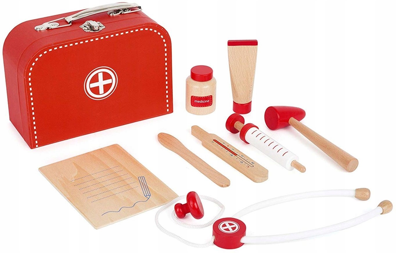 Дерев'яний набір лікаря від Small Foot, відомого виробництвом високоякісних дерев'яних іграшок. Дерев'яний набір маленького лікаря складається з 9 елементів, виготовлених з увагою до деталей. Окрім основного кольору деревини, використовували також червоний і білий, характерні для охорони здоров’я.