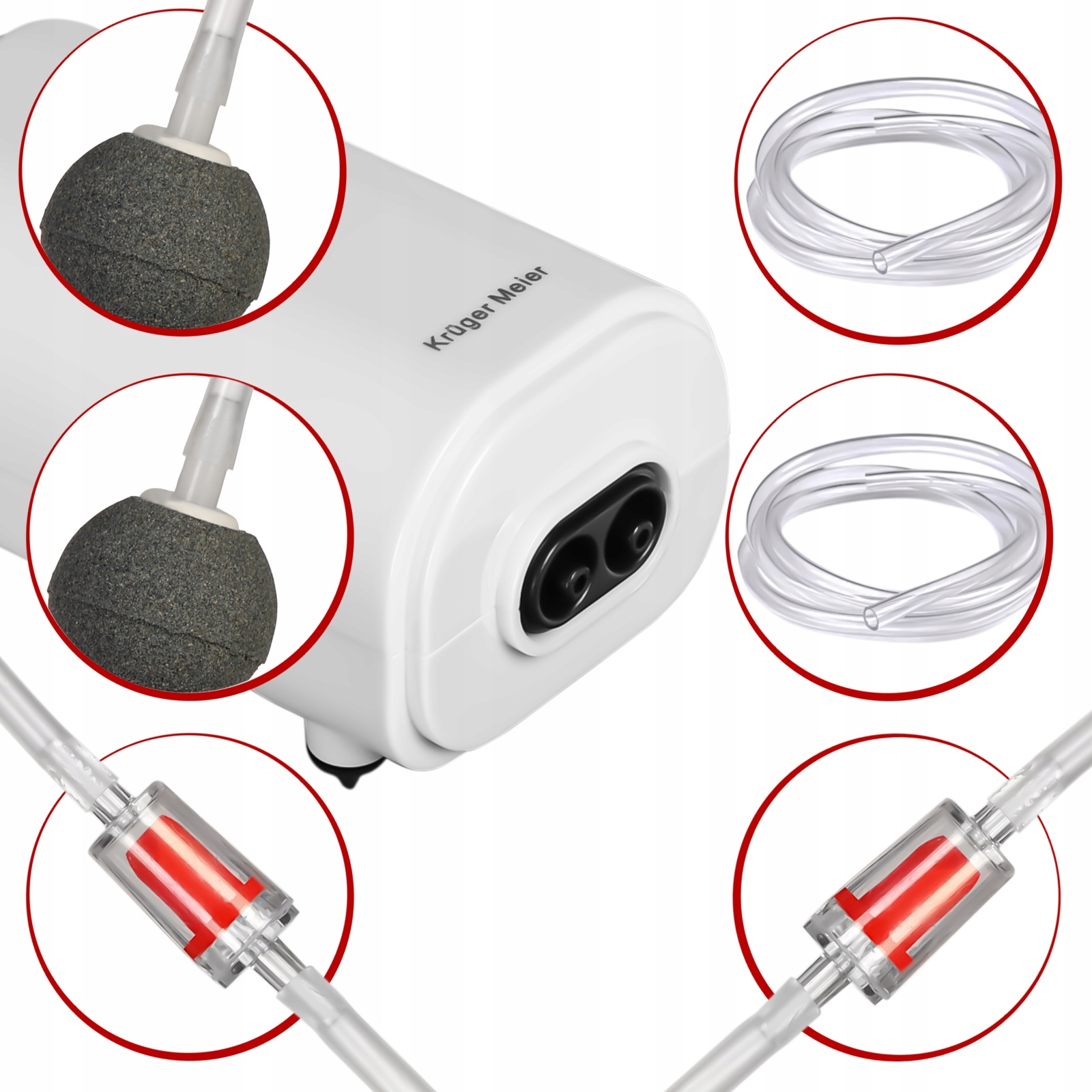 Подвійний комплект - аератор для акваріума від перевіреного бренду Kruger Meier. Це повний комплект подвійної аерації для будь-якого акваріума від 50 до 120 л. Коробка містить повітряний насос, 2 х шланги, 2 х зворотні клапани та 2 х повітряні камені. Повітряний насос надзвичайно тихий і енергозберігаючий, а також має регульовану продуктивність.
