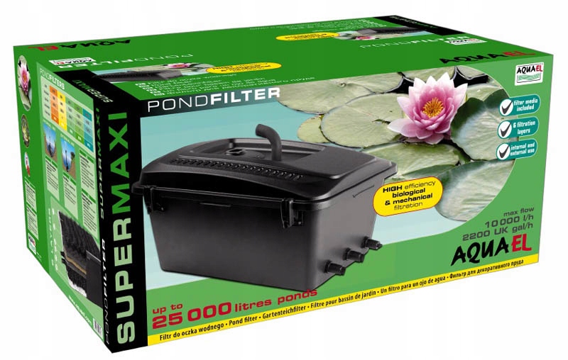 Це повний комплект фільтрації, що містить повністю сумісні компоненти. Фільтр оснащений рядом фільтруючих матеріалів, які очищають воду механічно, біологічно та хімічно. У набір також входить ультрафіолетовий стерилізатор, який руйнує ДНК клітин водоростей і бореться зі шкідливими бактеріями, вірусами та грибками, таким чином залишаючи корисні нітрифікуючі бактерії у фільтрі недоторканими. Це значно сприяє покращенню якості води. , а також для підтримки здорового середовища для риб і рослин у ставку.