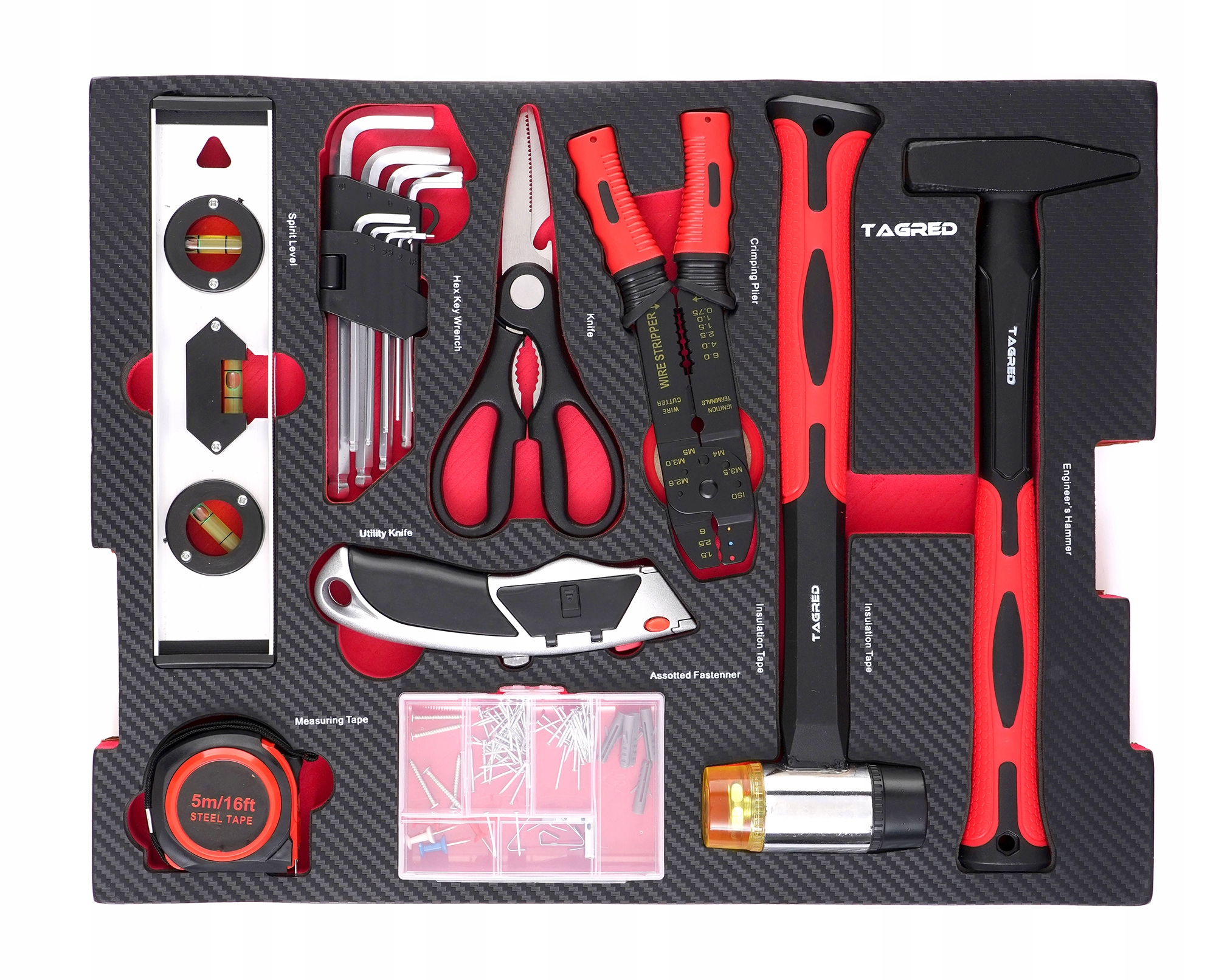 ✅ У набір входить цілих 188 інструментів, серед яких: ріжкові ключі, торцеві ключі, тріскачка, молоток, набір плоскогубців, рівні, мірна стрічка, ізоляційна стрічка, ніж, набір цвяхів та шурупів, а також а також викрутки та насадки для насадок.