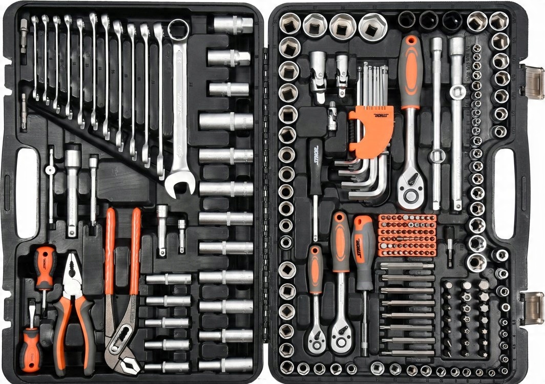 Набір інструментів STHOR складається з 225 елементів, розміщених у зручному пластиковому кейсі. Інструменти виготовлені з матеріалів, що забезпечують їх надійність.