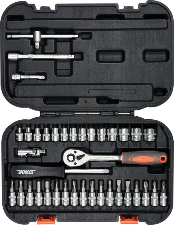 Набір інструментів STHOR складається з 38 елементів, розміщених у зручному пластиковому кейсі. Інструменти виготовлені з матеріалів, що забезпечують їх надійність.