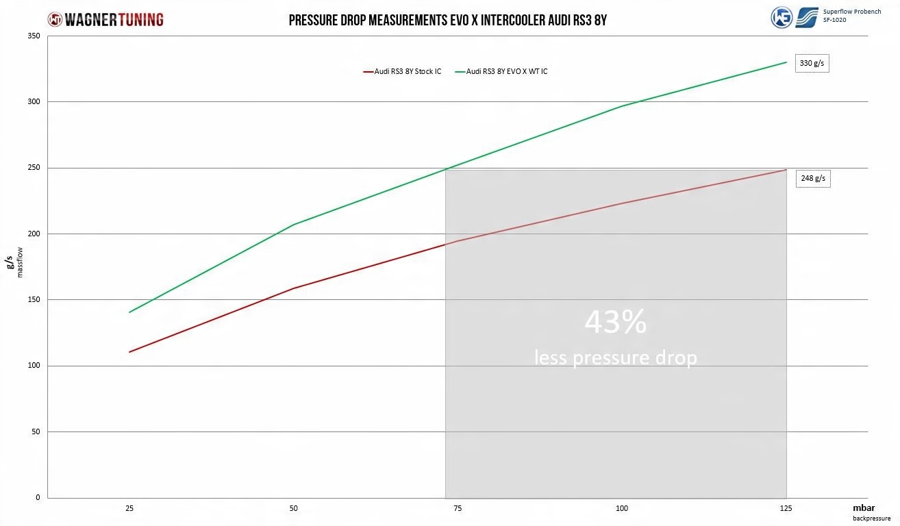 EVO x 135 мм = 28,9 л), що забезпечує на 127% більшу поверхню охолодження та на 250% більше об’єму наддувального повітря порівняно з оригінальним інтеркулером. Наші інженери збільшили розмір і ефективність серцевини проміжного охолоджувача, а також покращили конструкцію кінцевого бака, щоб усунути будь-які вузькі місця OEM, що призвело до збільшення номінального потоку та властивостей охолодження заряду. У цьому проміжному охолоджувачі Audi RS3 використовується наше удостоєне нагород WAGNERTUNING Competition Intercooler Core, створене спеціально для цього застосування. Виготовлений з високоякісних сердечників TUBE і FIN інтеркулера з внутрішніми турбуляторами в поєднанні з литими алюмінієвими кінцевими резервуарами, оптимізованими CFD для найкращого внутрішнього потоку повітря. За допомогою додаткових повітропроводів, всередині входу, забезпечується рівномірне наповнення інтеркулера. Результатом є чудові охолоджувальні властивості з мінімальним перепадом тиску. Тож цей набір якраз підходить для гонок. Інтеркулер і поперечина утворюють стабільний вузол і важать лише 18,0 кг. Він монтується до оригінальних точок кріплення та простий у виконанні (заміна 1:1). Оптимальне охолодження зарядженого повітря з явним збільшенням продуктивності! Оптимізовано для найкращого внутрішнього потоку з Ø82 мм вхідних і випускних отворів.