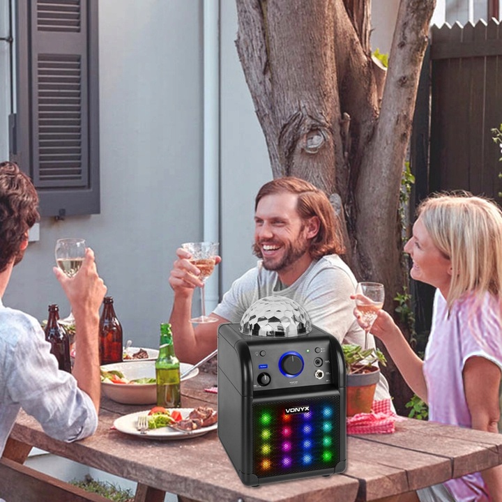 Цей універсальний набір для караоке з надійною потужністю гарантує незабутню вечірку. На додаток до підсвічування в решітці динаміка, він має світловий ефект Jelly Ball у верхній частині. Тож у вас є повне налаштування звуку та світла в одному пристрої. Завдяки вбудованому акумулятору ви маєте повну свободу та мобільність. Ви можете співати, виступати та розважатися, де завгодно.