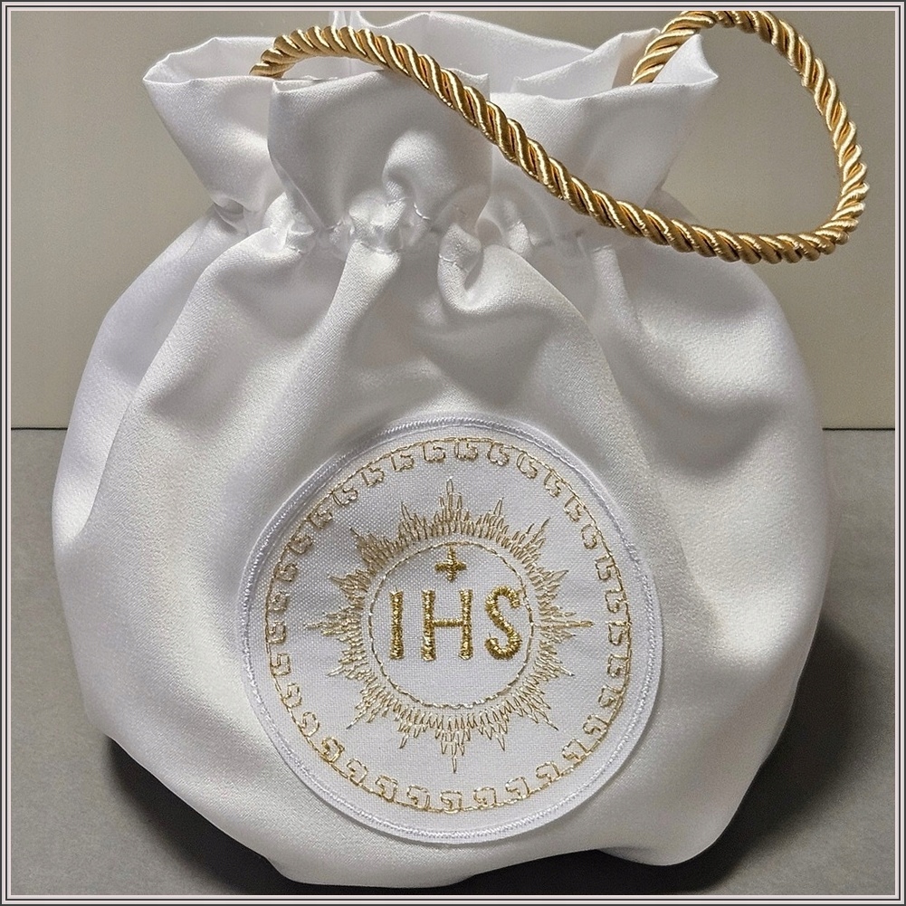 Елегантне атласне плаття з вишитим золотими нитками аплікацією IHS і атласною сумкою у формі сумки, прикрашеною золотим крученим шнурком і аплікацією IHS.