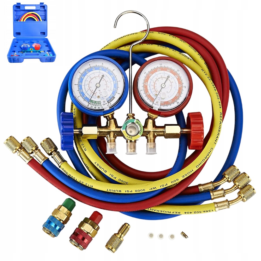 Професійний набір манометрів для заповнення та перевірки герметичності автомобільних та стаціонарних системи кондиціонування повітря, що містять холодоагент R134a. Манометри також дозволяють точно перевіряти рівень тиску в системі кондиціонування повітря та проводити вимірювання для систем високого та низького тиску. Вони дводіапазонні, тобто вказують температуру та тиск у системі кондиціонування повітря.