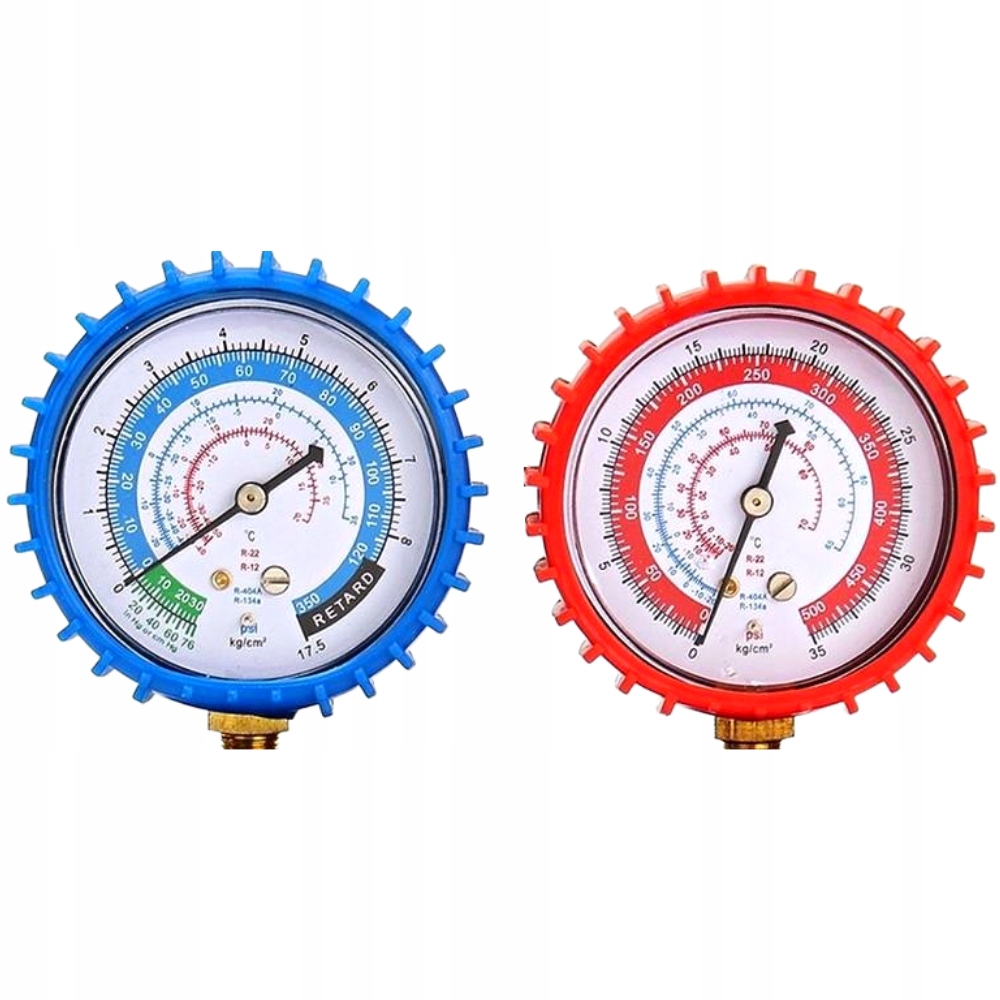 - Два манометри зі шкалою для холодоагентів R134a, R12, R22, R502