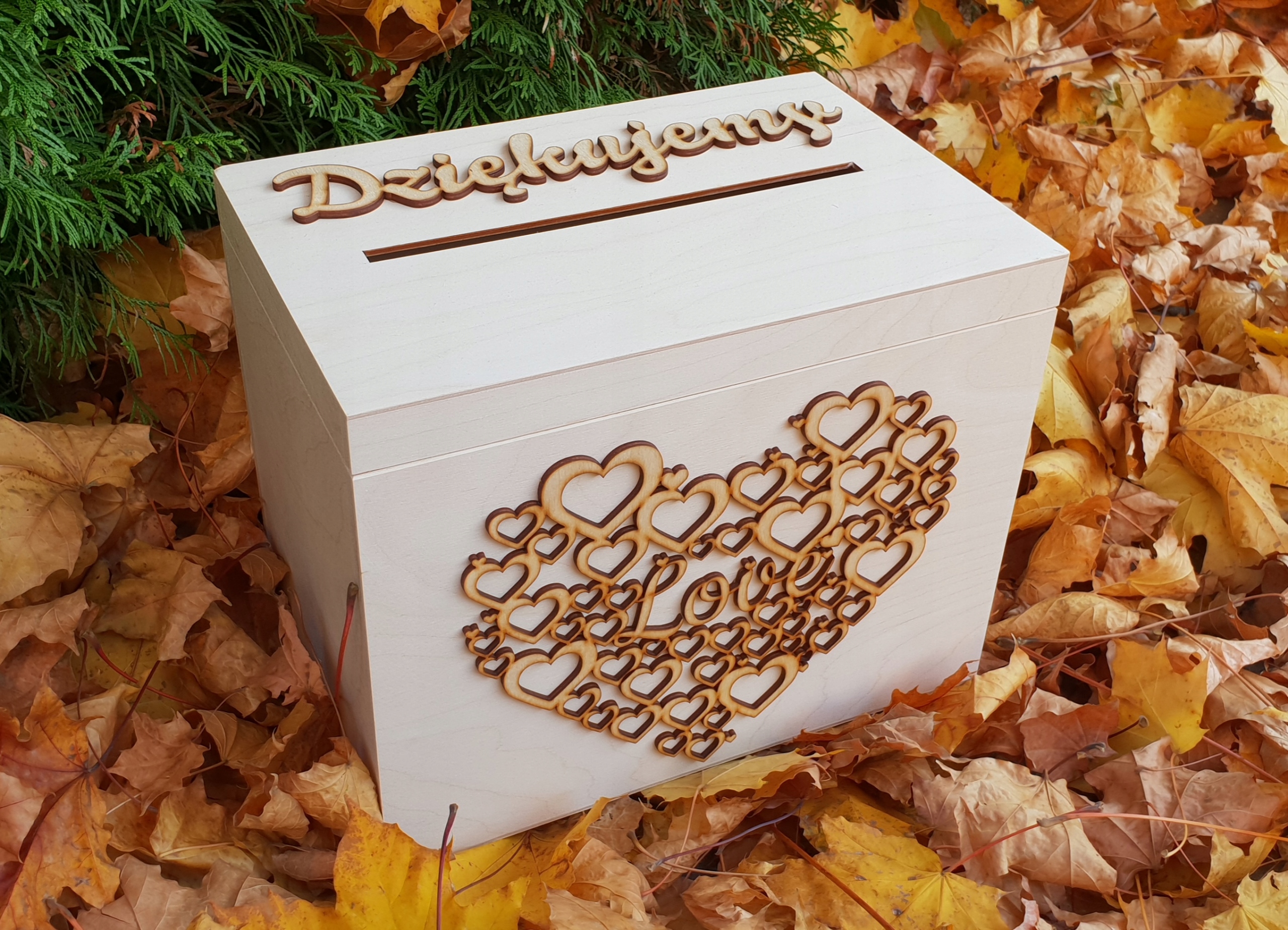 Дерев'яна коробка для весільних конвертів з 3D візерунками спереду та збоку.