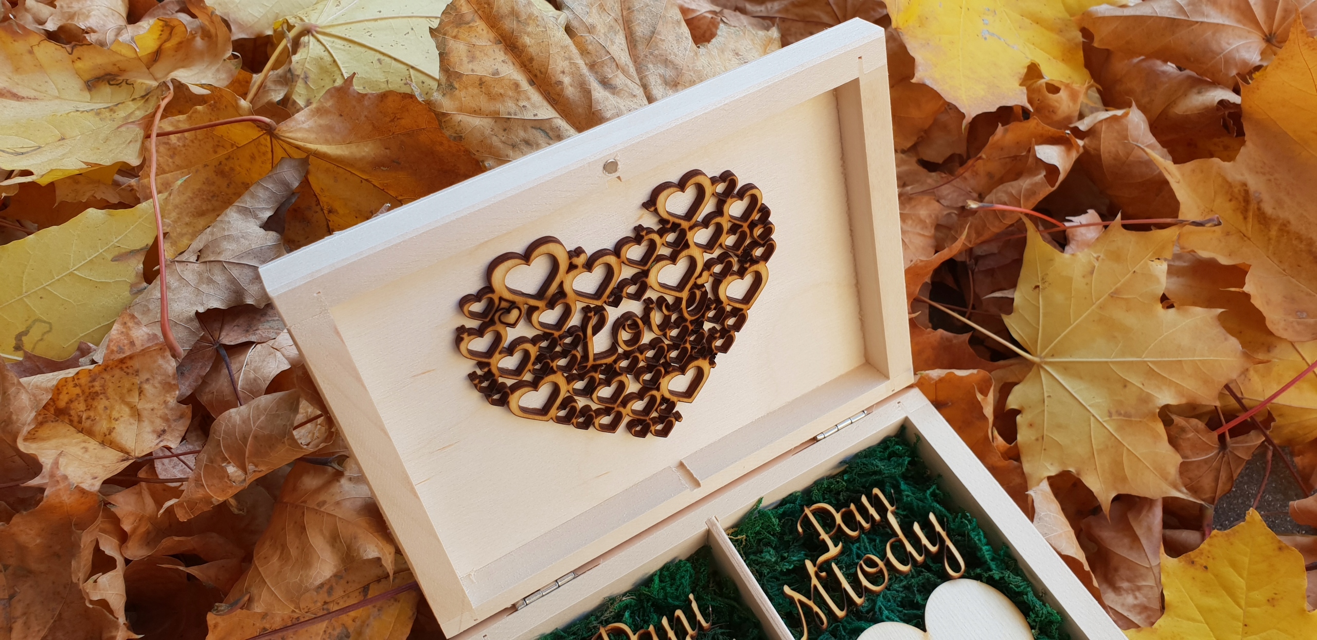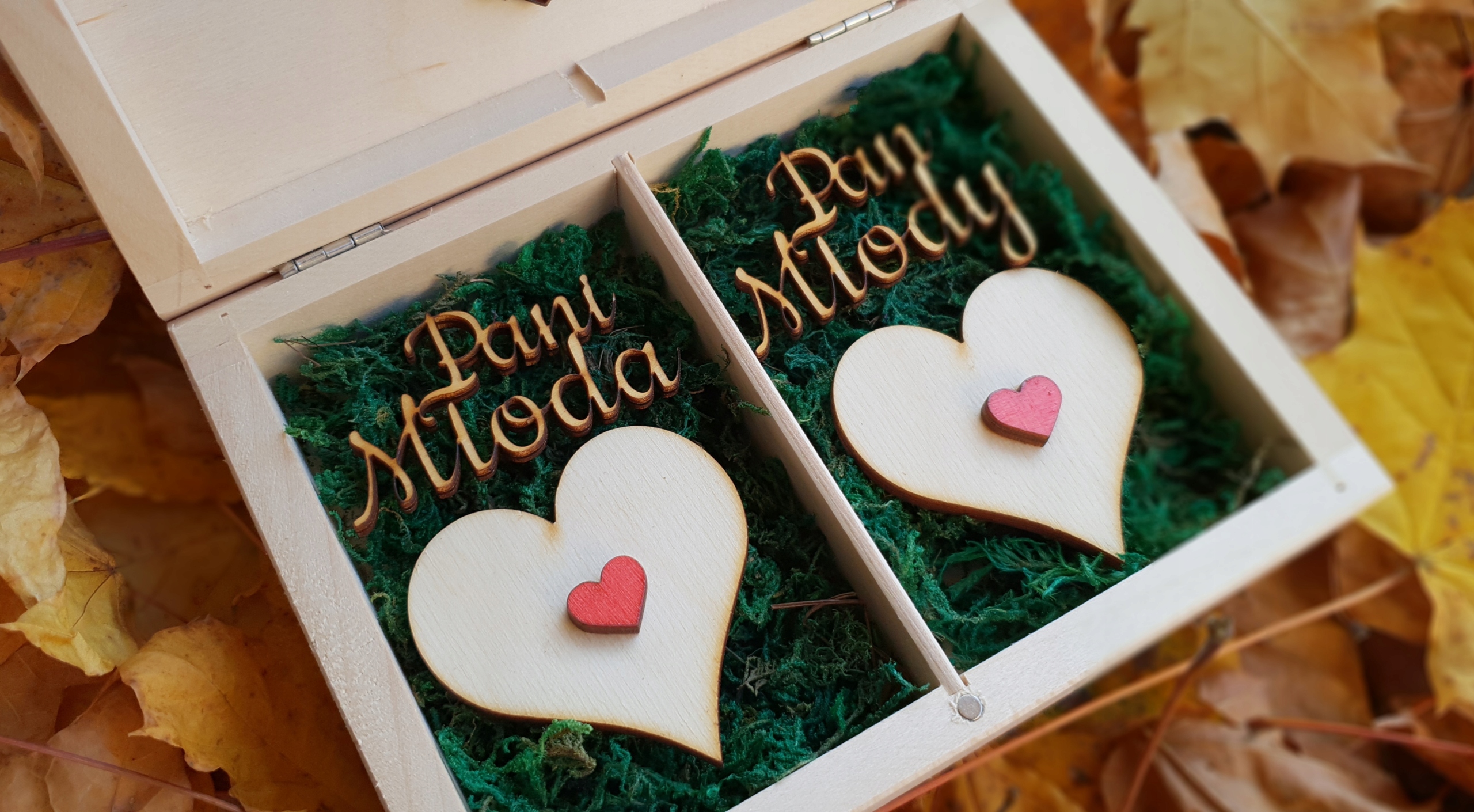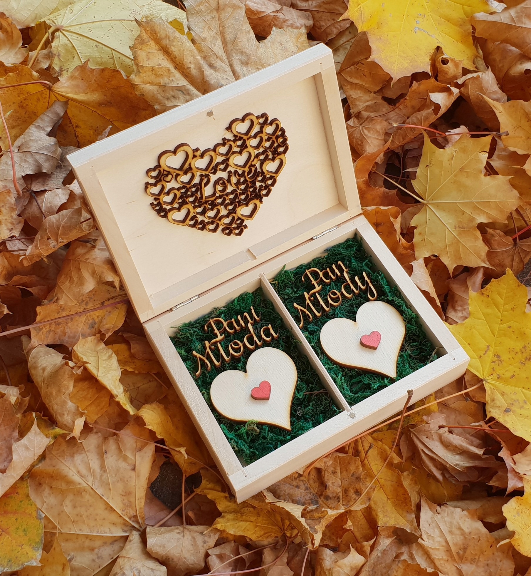 - ШКАТУЛКА ДЛЯ ОБРУЧОК з натуральним мохом і червоними сердечками