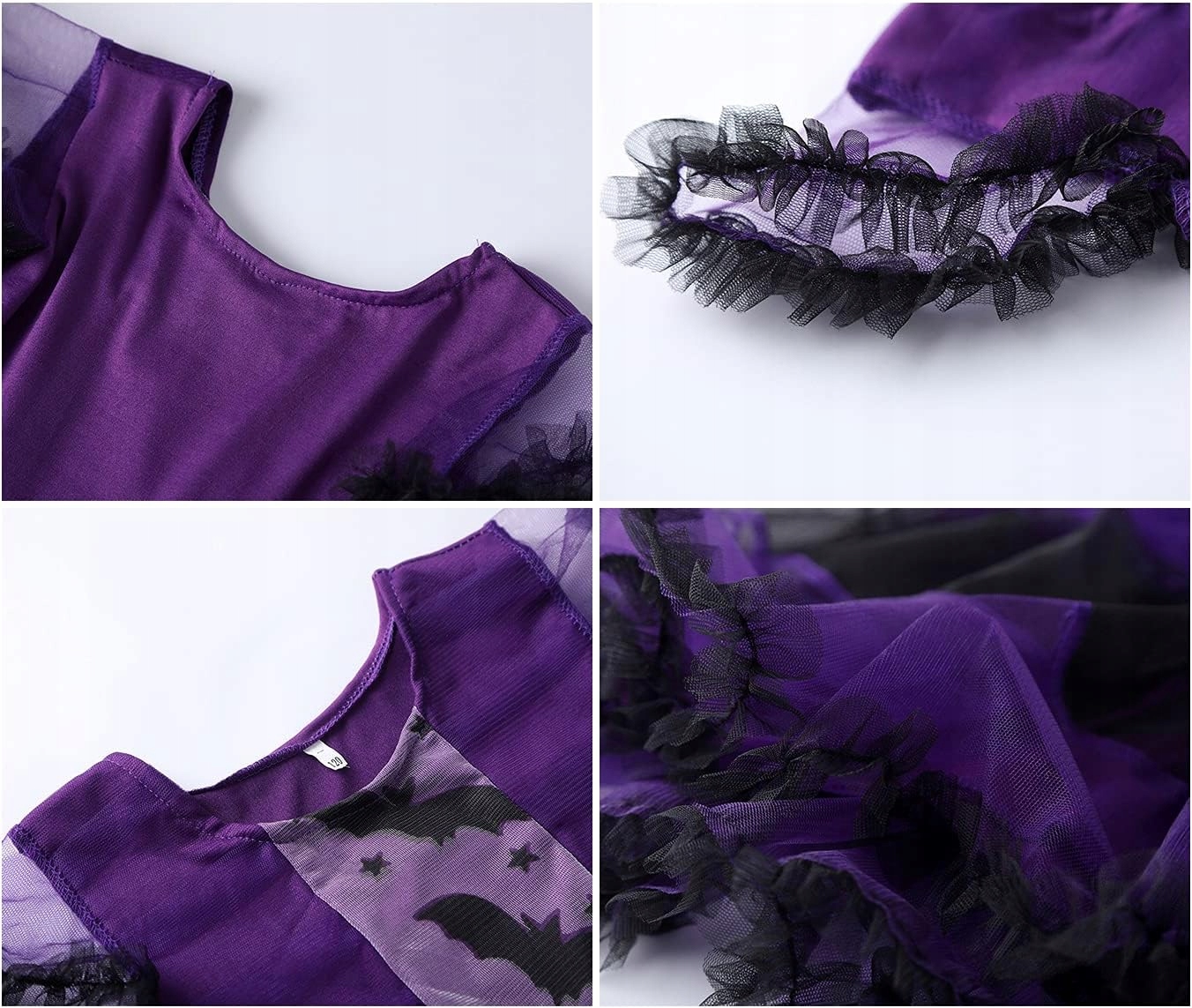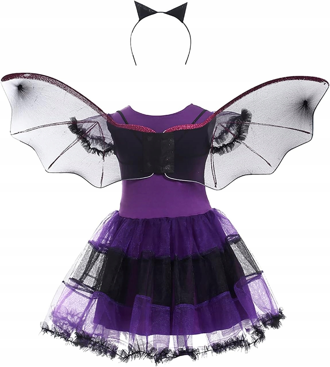 Дозвольте магії Хелловін стане справжньою пригодою! Фіолетово-чорний костюм вампіра вражає ефектною розкльошеною спідницею з фатину, легкими крильцями та чарівною пов'язкою з вушками. Ідеально підходить для маленької леді, яка любить загадковий, але чарівний стиль.