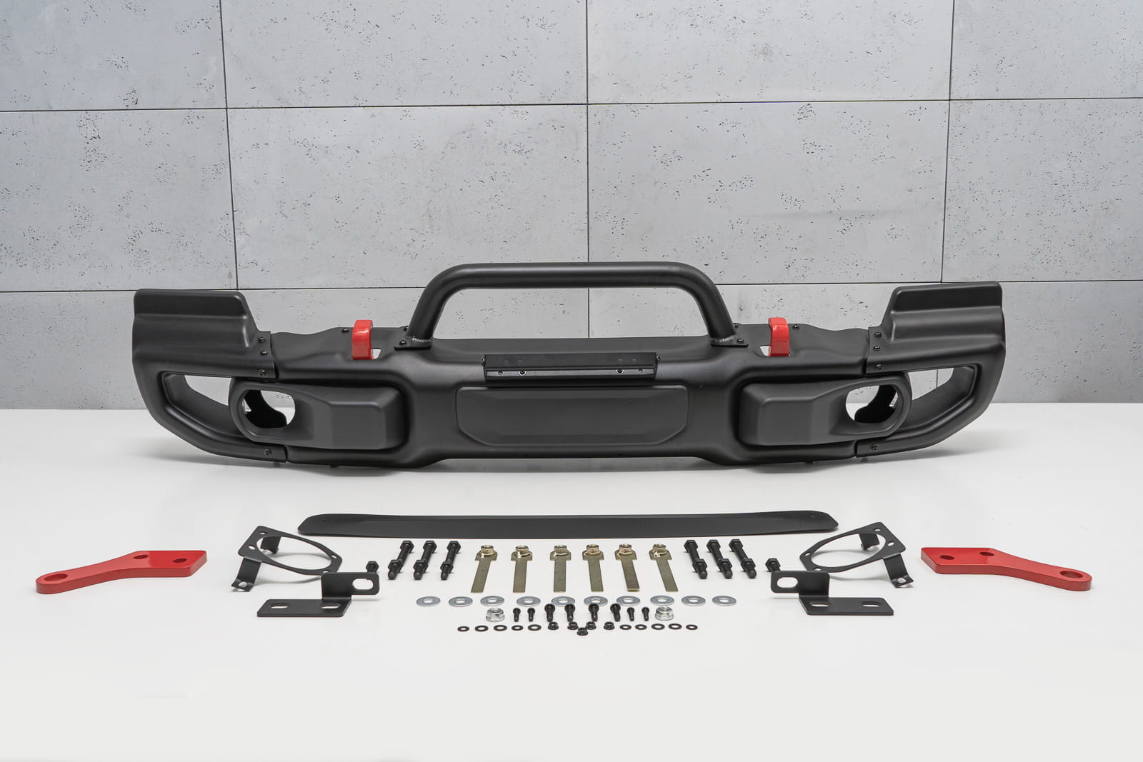 - Передній бампер -дизайн RUBICON 10th ANNIVERSARY, призначений для версії JEEP WRANGLER JK SPORT S (без датчиків паркування "PDC"). Це модульний бампер; є можливість демонтажу бічних сталевих елементів, що дозволяє збільшити дорожній просвіт та покращити кут заїзду. На бампері є місце для установки та пластина для електролебідки, червоні буксирувальні гаки для дужок, металеві рамки для протитуманних фар і додаткові кріплення для робочих фар.