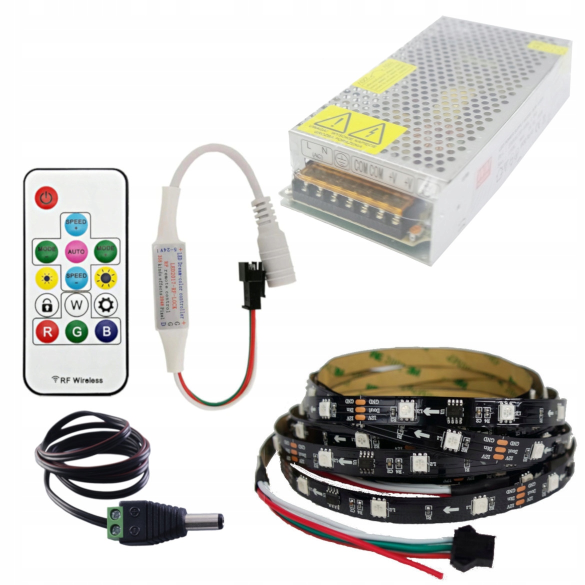 Набір цифрової світлодіодної стрічки Magic з контролером MAGIC RGB , 14-клавішний радіочастотний пульт дистанційного керування та блок живлення. Контролер дозволяє управляти кожним світлодіодним модулем окремо. Завдяки цьому набору ви досягнете світлових ефектів, недоступних у типових комплектах RGB LED. Стрічка може світитися будь-яким кольором - червоним, зеленим, синім, сумішшю цих кольорів і холодним білим. Набір є імітацією системи Ambilight - дає схожий ефект. Він має 358 режимів, які можна перемикати за допомогою пульта дистанційного керування, можливість змінювати колір, вмикати/вимикати, налаштовувати яскравість, швидкість освітлення тощо.