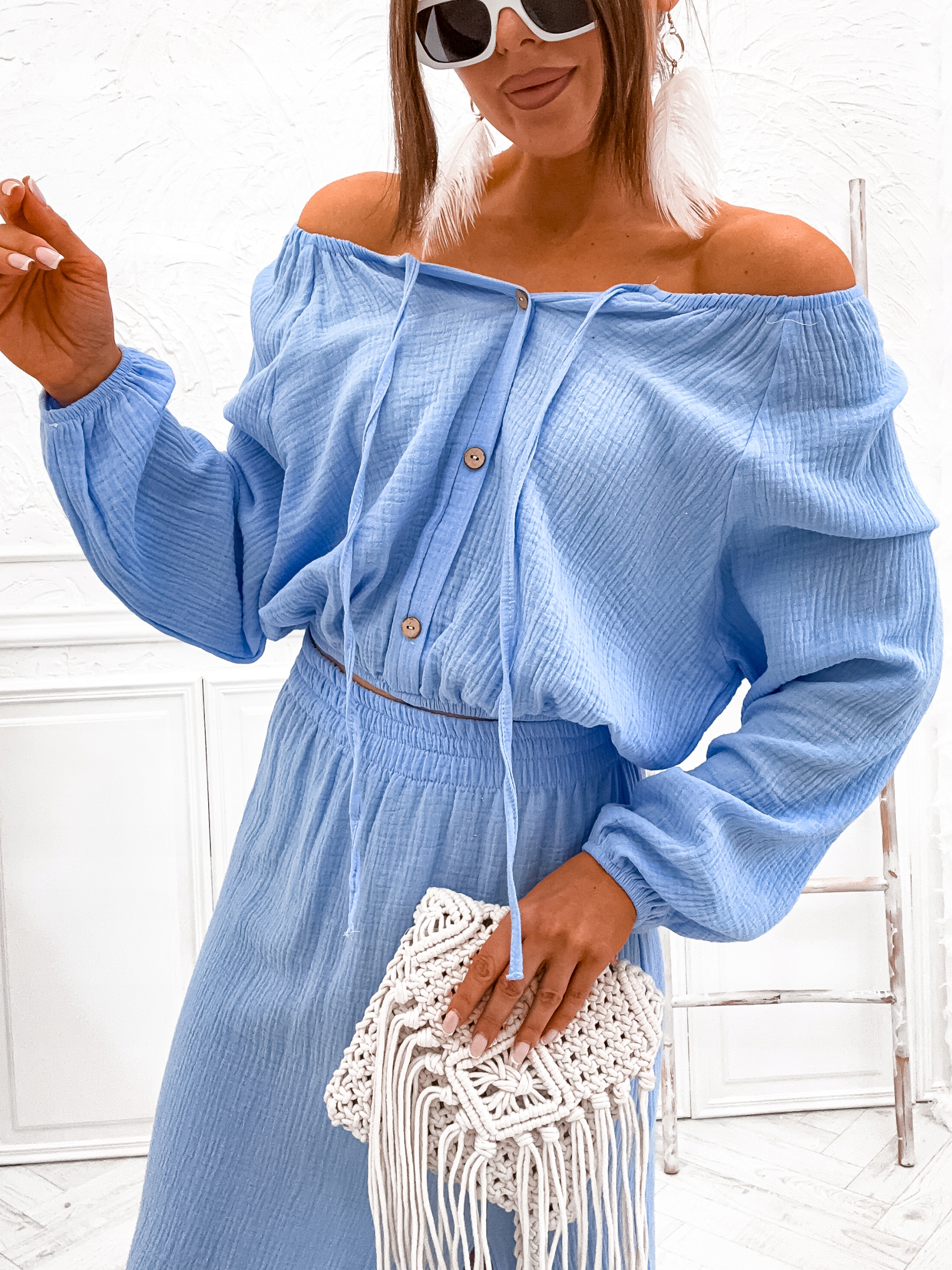 КОМПЛЕКТ ЛІТНІЙ МУСЛІН, СПІДНИЦЯ ПЛЮС БЛУЗА, розмір, колір: білий, синій