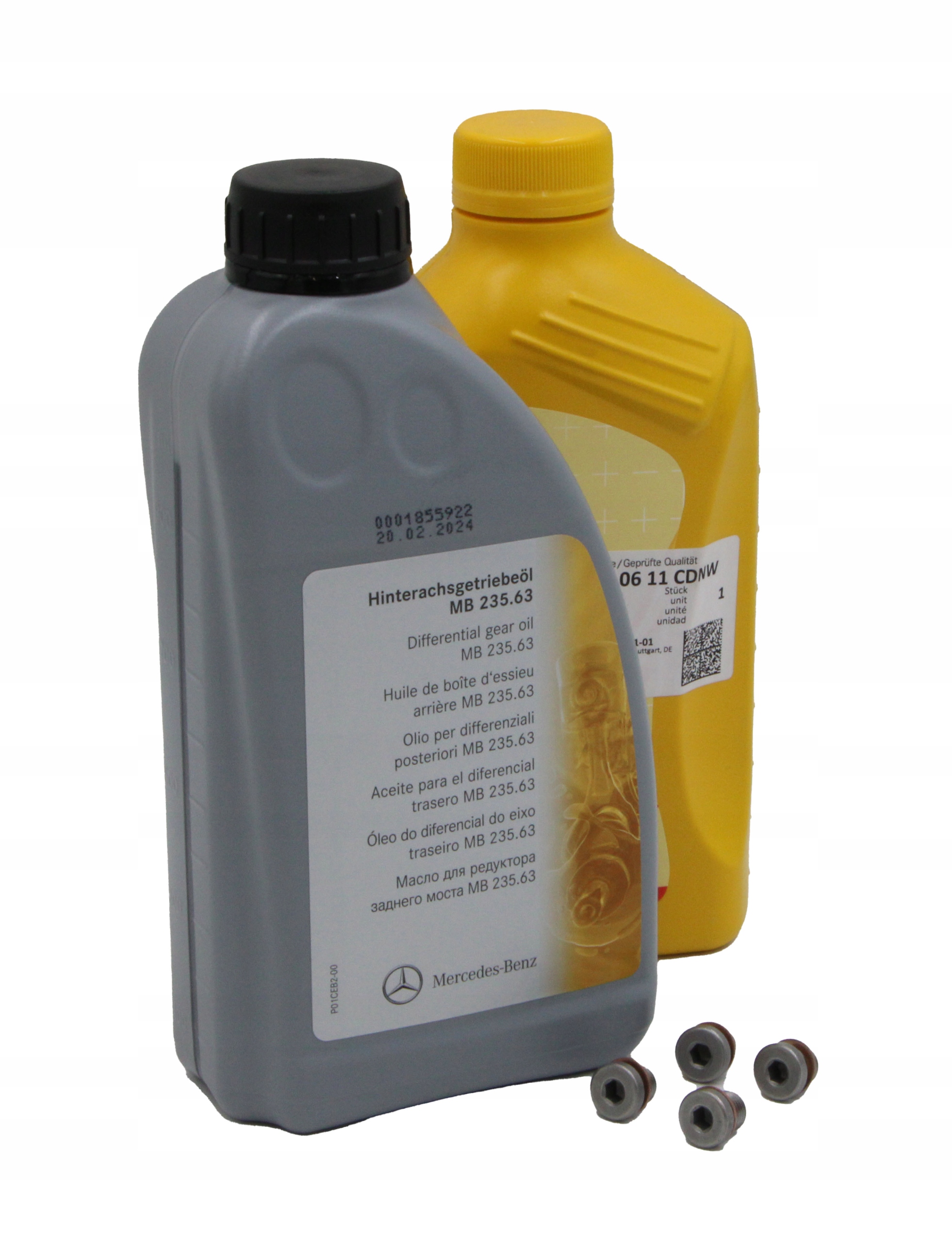 Набір трансмісійних масел і свічок заднього моста (диф) для автомобілів Mercedes-AMG A class W177, CLA C/X118, GLA H247 У набір входить: 1L x AXLE DIFFERENT OIL MERCEDES MB 235.63 A000989360811 1L x МАСТИЛО ДЛЯ ЗЧЕПЛЕННЯ ВІСІ MERCEDES MB 235.64 A000989440611CDNW 4 x ГВИНТОВА ПРОБКА ДЛЯ ЗЛИВУ МАСЛА MERCEDES ДИФЕРЕНЦІАЛ A177990110064