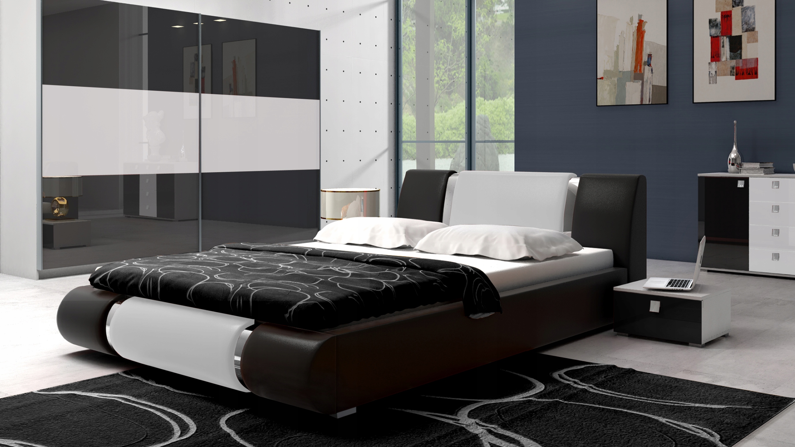 Велике м'яке ліжко, чорне з білими вставками, з екологічної шкіри з розмірами матраца: