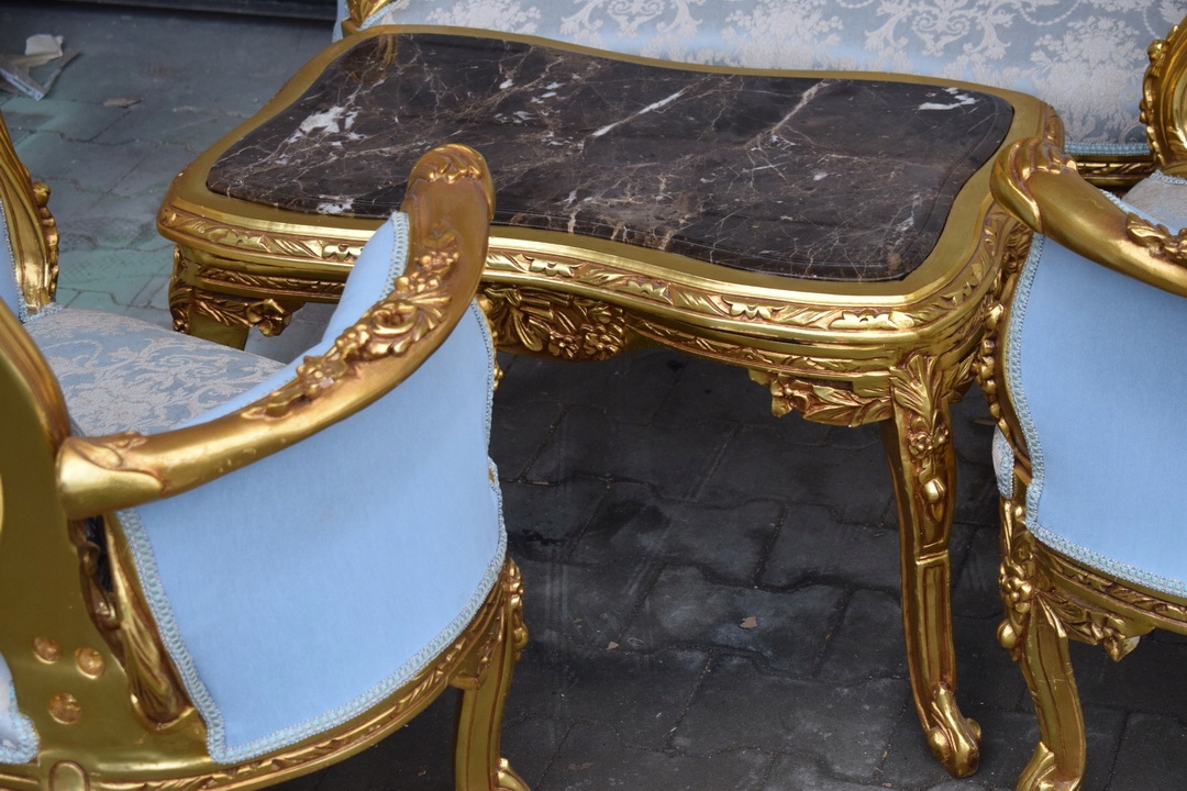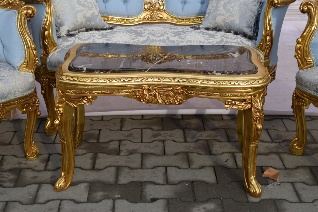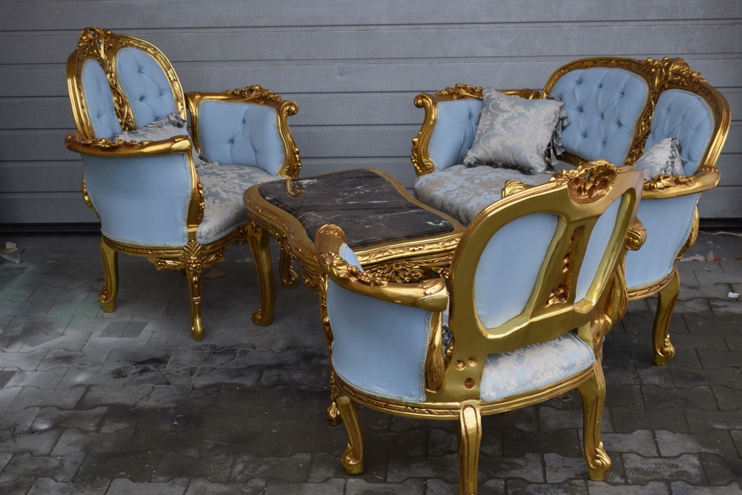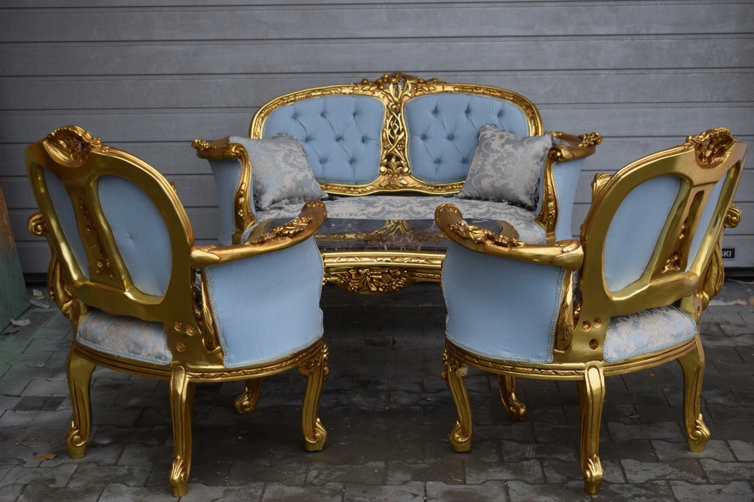 Komplet Mebli - Zestaw Kawowy + Sofa + 2 Fotele + Stół Barok - Błękitny