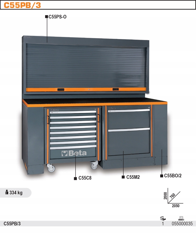 БЕТА КОМПЛЕКТ МЕБЛІВ ДЛЯ МАЙСТЕРНІ RACING SYSTEM C55, C55PS+C55C8+C55M2+C55B/2, ПОРОЖНИЙ, СІРИЙ RAL 7016 З ПОМАРАНЧЕВИМ ПОКРІБЛЕННЯМ, 2050X2000X760MM