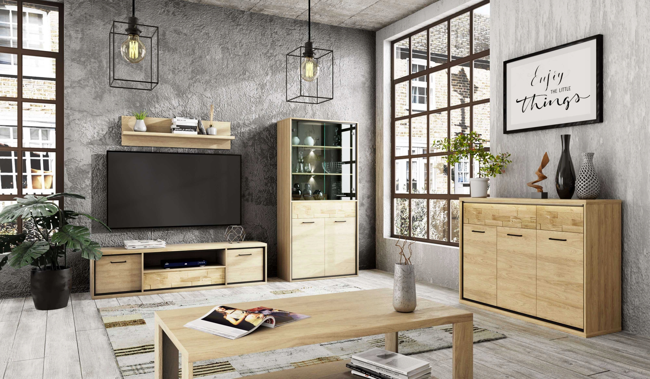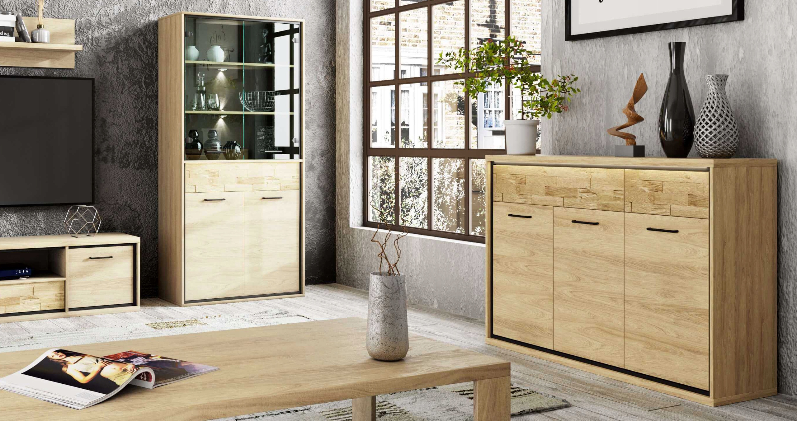 - Великий комод до Ширина 177 см. Нижня частина складається з двох шаф-купе з подвійними дверима. У кожному з них є полиця для зберігання. Комод має дві шухляди, які відкриваються на дотик і висуваються по напрямних. В дверях використовуються петлі найвищої якості з безшумним закриванням, суцільні, металеві. Чорні ручки та декоративна планка навколо меблів створюють цікаве поєднання зі світлим меблевим щитом. Колір найбільш наближений до натурального кольору дерева.