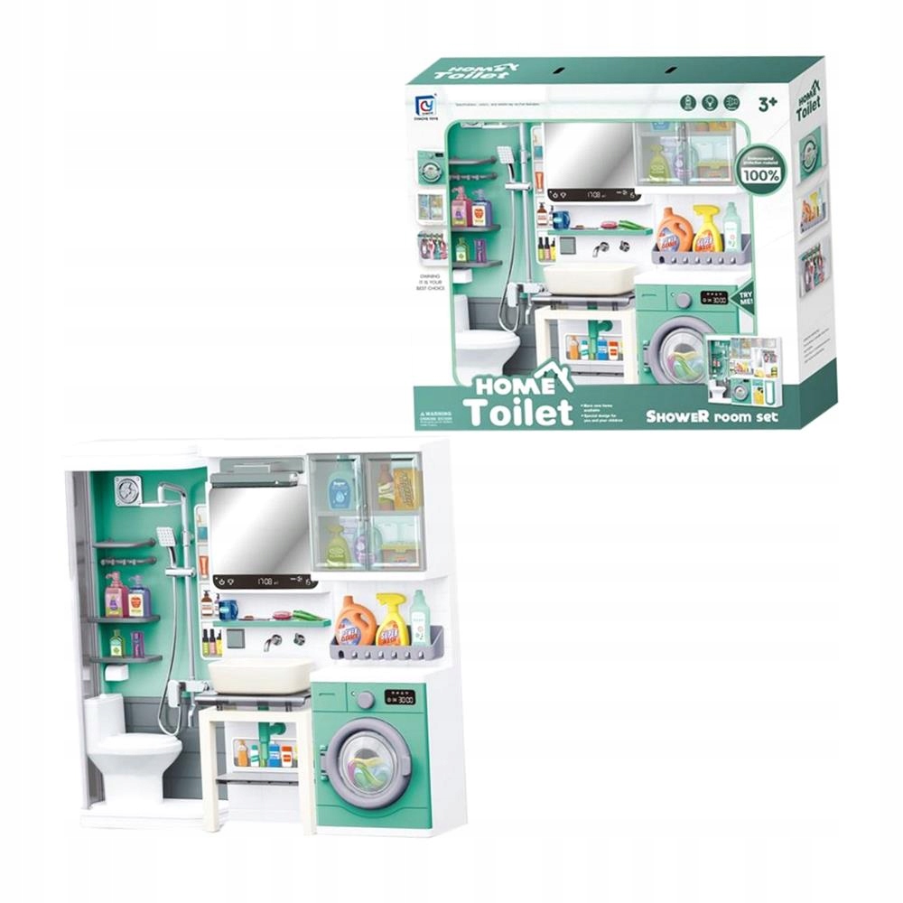 Комплект меблів для ванної складається з одного елемента з пральною машиною, іншого з умивальником і третього з унітазом і душем. У набір також входять аксесуари для ванної кімнати і верхні тумби. Звукові та світлові ефекти. Потрібні батарейки - 3xAA і 1xAAA (не входять в комплект).