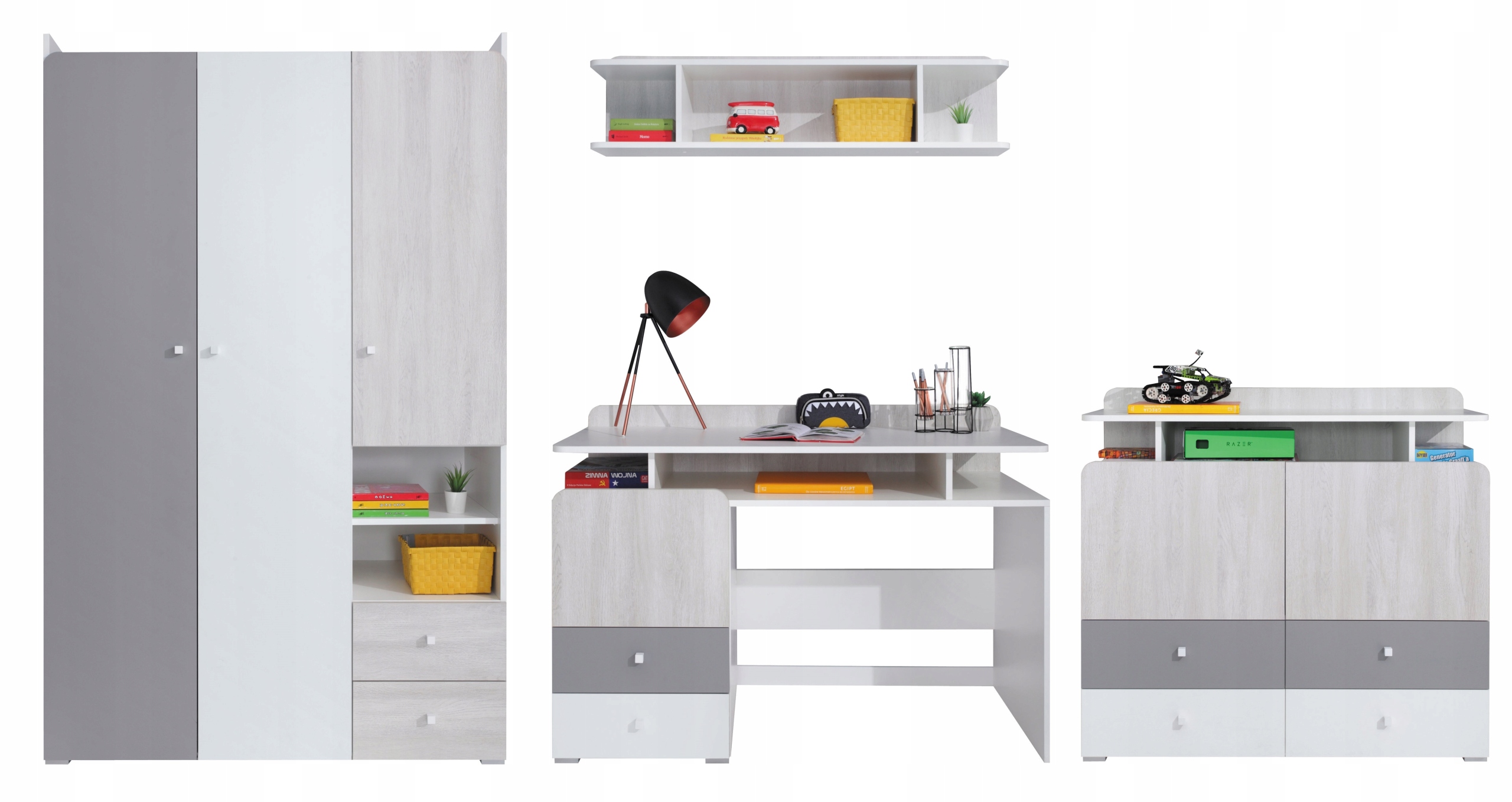 Білий + Білий Дуб Wilton + Сірий. Таке колірне поєднання є універсальним рішенням для кімнати хлопчика або дівчинки. Унікальний вигляд меблів змінить кожну дитячу молодіжну кімнату