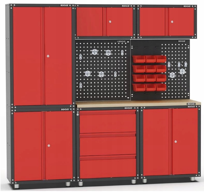 Меблі для майстерні на піддоні, для самостійної збірки в RMS (модульна система Rooks), з суцільною металевою конструкцією з двосп. двері суцільні, з профільним посиленням, на замок. Всередині шаф є перфорований лист, що дозволяє максимально використовувати простір і при цьому легко стежити за порядком.