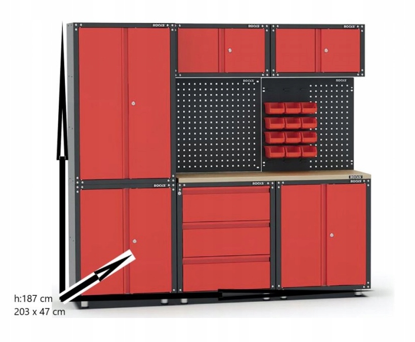 Меблі складаються з великої шафи, шафи з ящиками та дверцятами, двох підвісних шаф, дошок для інструментів. з лотками і гачками для інструментів і дерев'яною стільницею для шаф. Загалом складається з 34 елементів, які ідеально організують простір у вашому сервісному центрі.