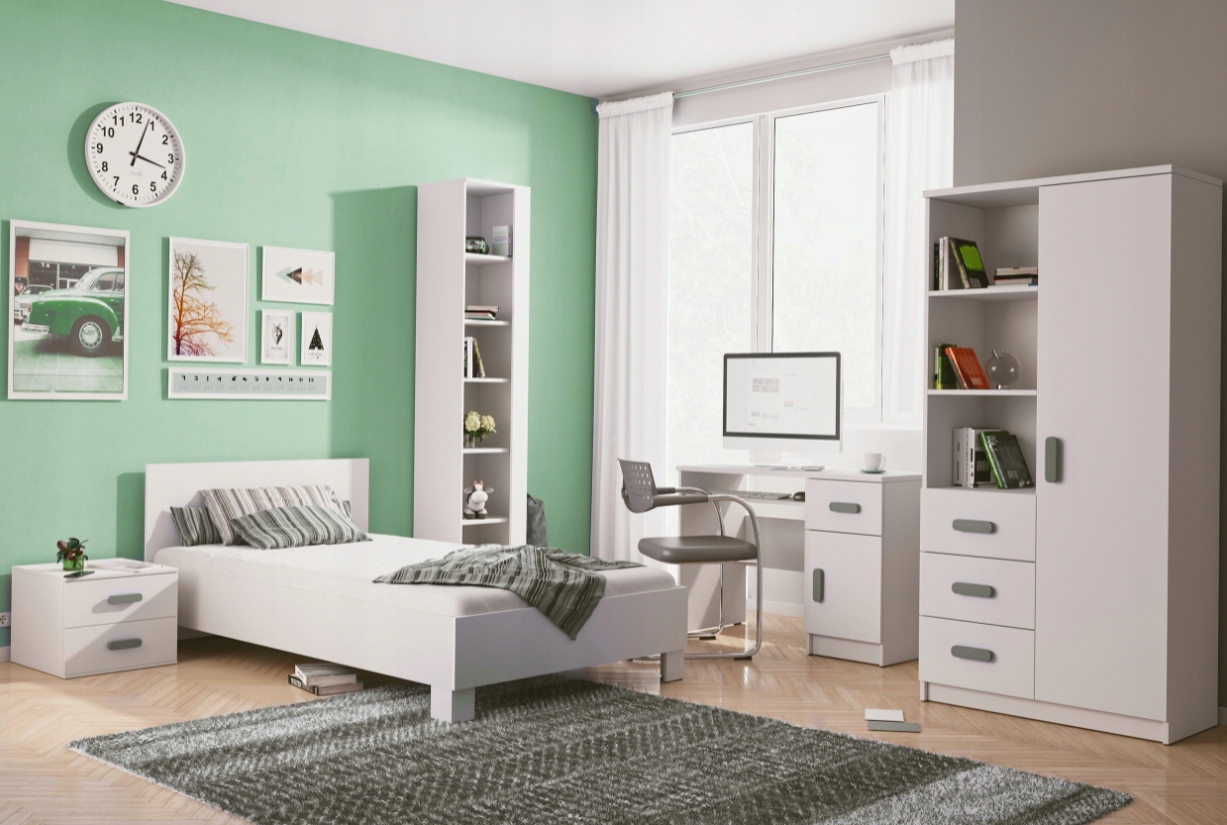 Красивий набір білих меблів для дитячої кімнати: ліжко, книжкова шафа х2, письмовий стіл, тумбочка - система SMYK I
