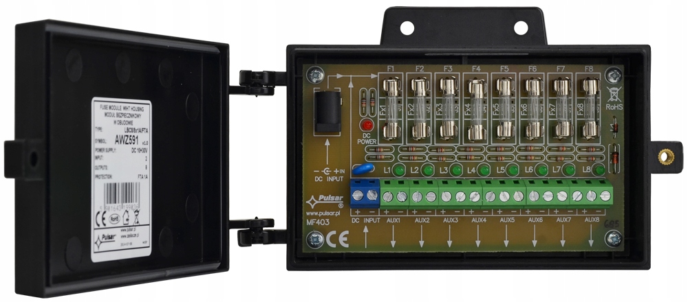 8 -CHANNEL -модуль запобіжника, що дозволяє розподілити напругу в діапазоні постійного струму 10-30 В. Оснащений варистором та випусками з запобіжниками, він характеризується хорошим електричним захистом підключених пристроїв. 4 Виходи: 8