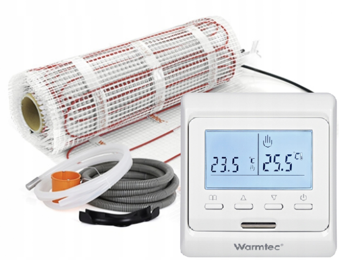 Повний комплект електричної теплої підлоги від Warmtec. Програмований терморегулятор із великим чітким РК-дисплеєм. Односторонній самоклеючий нагрівальний мат і аксесуари для легкого встановлення.