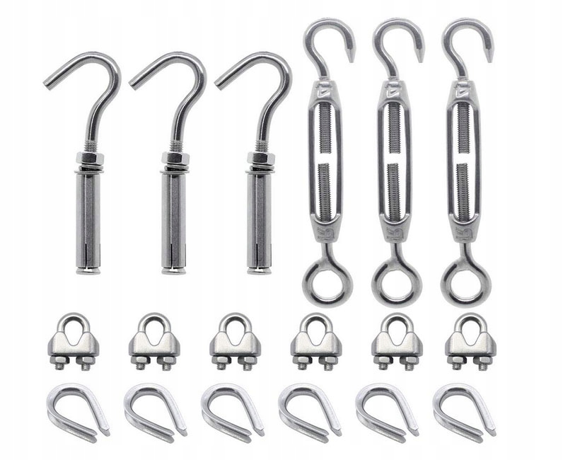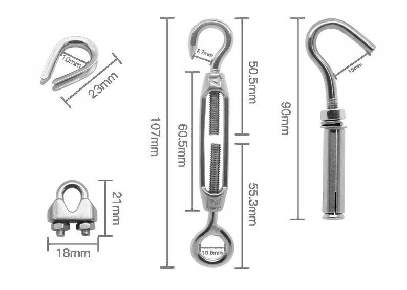 У наборі: 3 x M4 натягувач сталевого канату з поворотною муфтою 3 x M6 подовжувальні гаки 6 x M3 затискачі для мотузки 6 x M3 канатні втулки