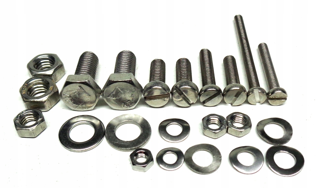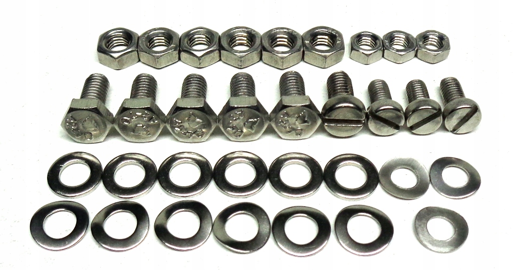 Набір складається з елементів з хромонікелевої нержавіючої сталі класу A2 70. Набір включає гвинти, гвинти, гайки та шайби, розділені на 17 окремо упакованих груп, що дозволяє безпроблемно збирати окремі компоненти мотоцикла. В групу "Підвіска передня" додана гайка-гайка з оцинкованим покриттям 8 класу.