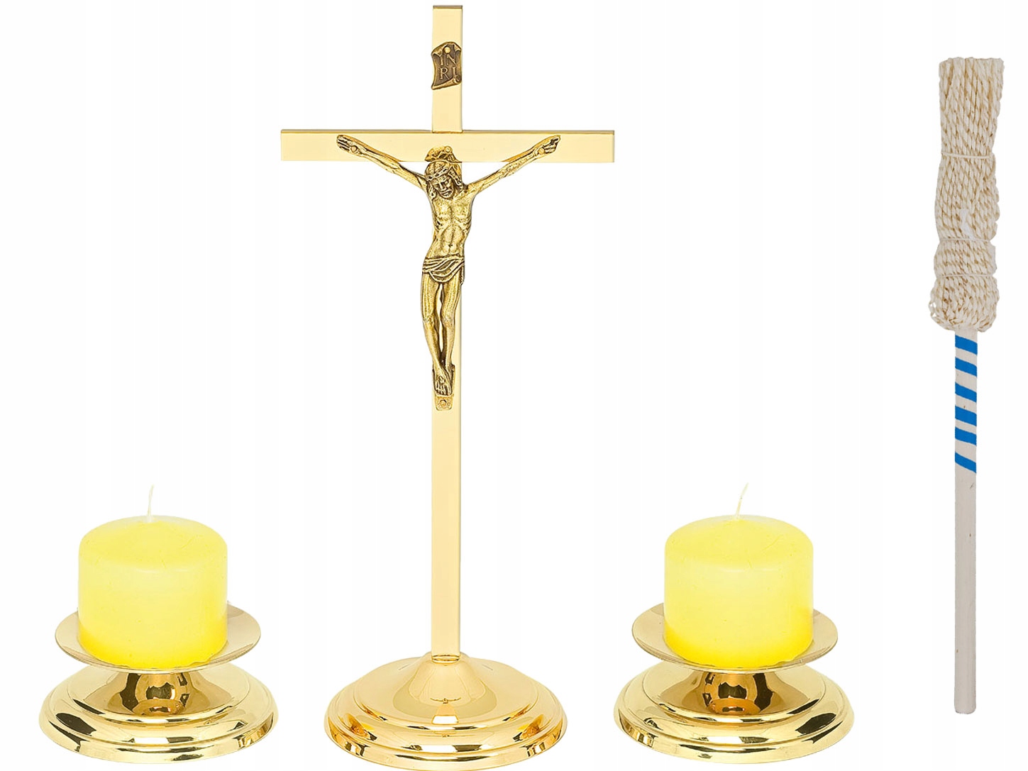 Набір складається з сучасного хреста висотою 30 см та двох підсвічників для свічок з шипами. Крім того, набір містить дві жовті свічки з шипами та дерев’яну кропильницю.