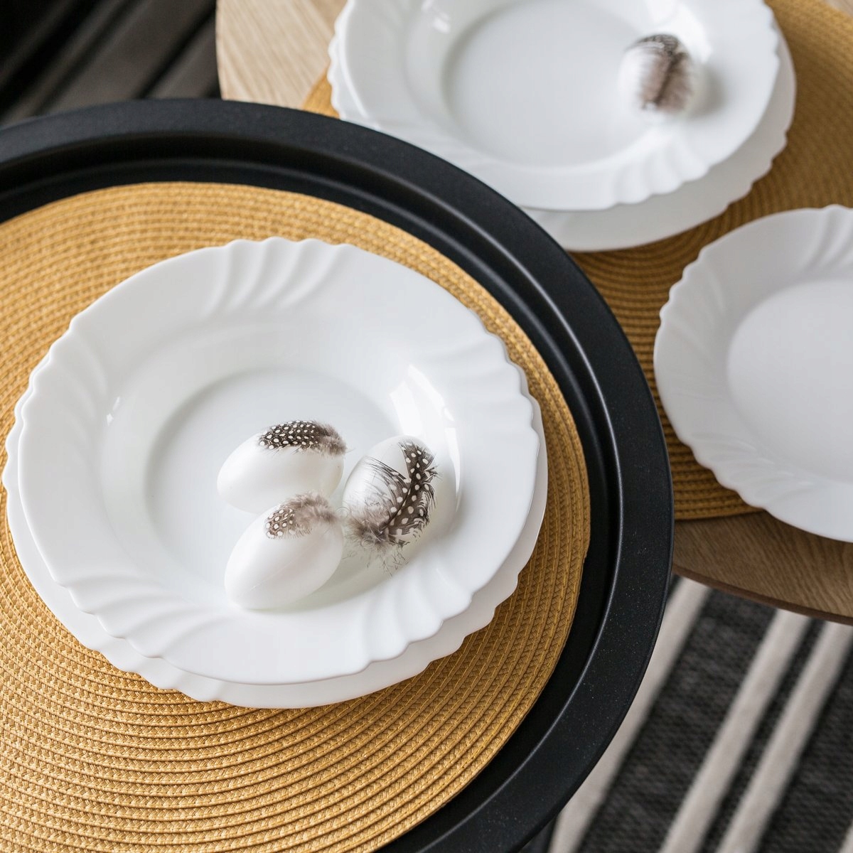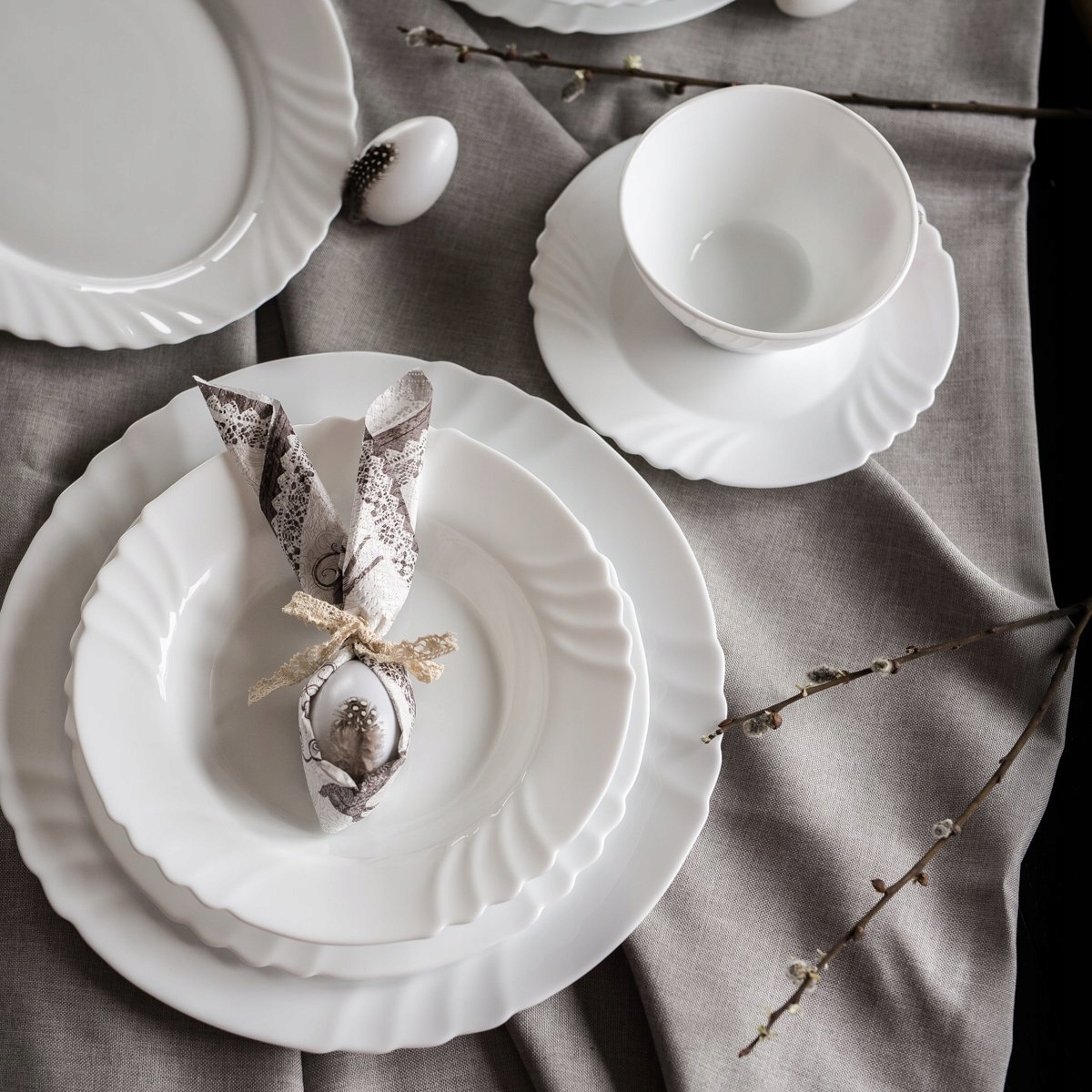 Обідній набір класичного білого кольору, з тонким тисненим малюнком. Такий обідній сервіз знайде своє місце в кожній їдальні. Виготовлений з високоякісного білого скла. Посуд стійкий до перепадів температури. Можна мити в посудомийній машині.