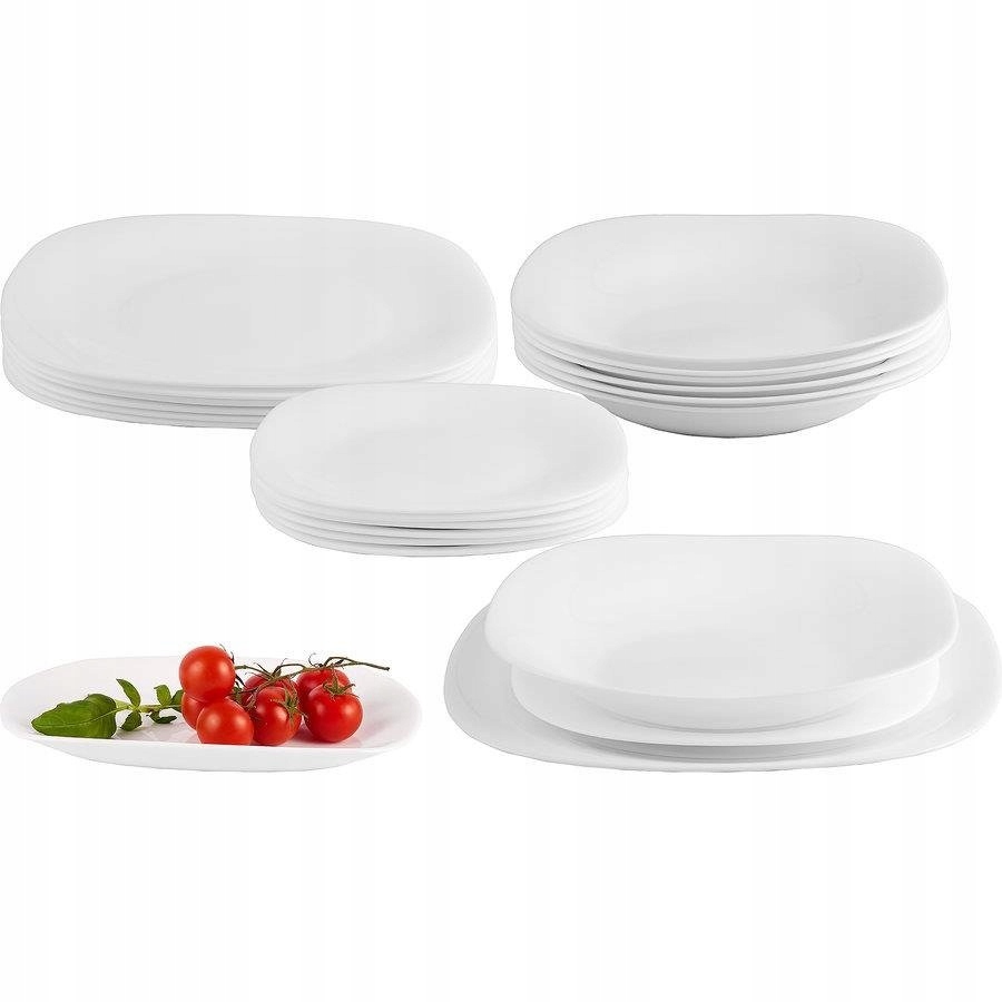 Сервіз в сучасному, елегантному виконанні. Класичний білий і мінімалістичний дизайн. Ідеально підходить для невеликих вечірок. Столовий набір виготовлений зі скла Opal Glass, стійкого до пошкоджень. Набір можна мити в посудомийній машині.