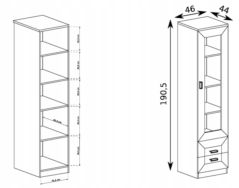 - site Tadeusz T-10: 46_x_190_x_44 - 1-дверна відкидна шафа-вітрина з двома ящиками, полицями з кольорового ЛДСП