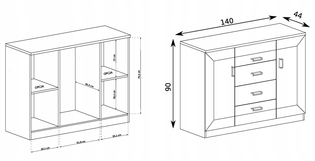 - комод Тадеуш T-06: 140_x_90_x_44 - великий комод посередині має простір з 4 ящиками, крім того, на зовнішніх сторонах є шафи за передньою стороною з однією полицею на кожній