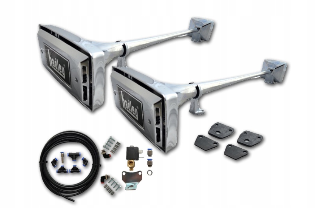 Набір з двох прямокутних пневматичних сигналізаторів, виготовлених із хромованої сталі. Виробник HADLEY. Призначений для автомобілів з пневматичною установкою. Сигнали Hadley мають унікальний дизайн і індивідуальне звучання, завдяки чому їх впізнають у всьому світі. У набір входить повний монтажний комплект і електромагнітний клапан 24 В.