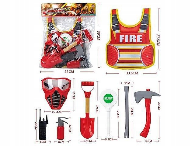Повне спорядження пожежного - жилет, маска, лопата, сокира, рація, вогнегасник, лом і знак СТАРТ