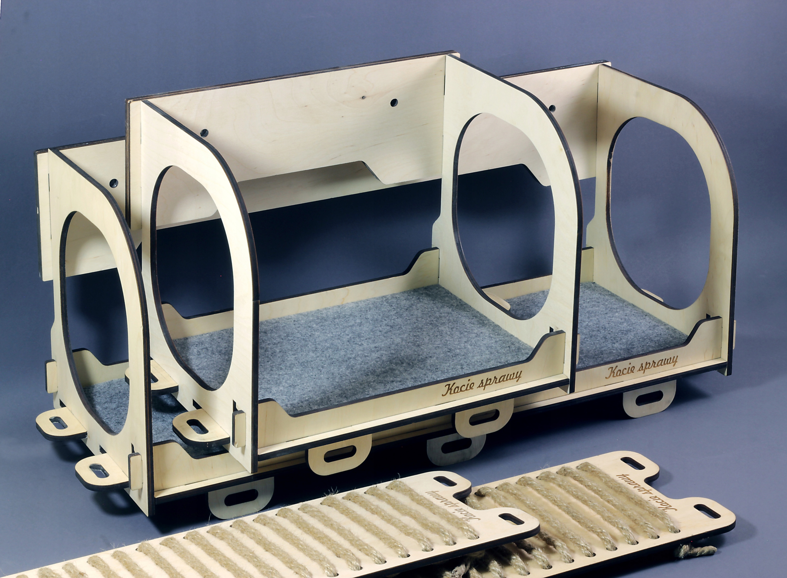 Для виготовлення котячих меблів ми використовуємо високоякісну березову фанеру, оброблену шаром сертифікованої олії. Підлогу зазвичай покривають шаром повсті, а пішохідний міст сплетений з джутової мотузки, яка створює дряпку, яку люблять коти. Ми виготовляємо наші меблі з пристрастю, збираючи думки доброзичливих експертів з котів.